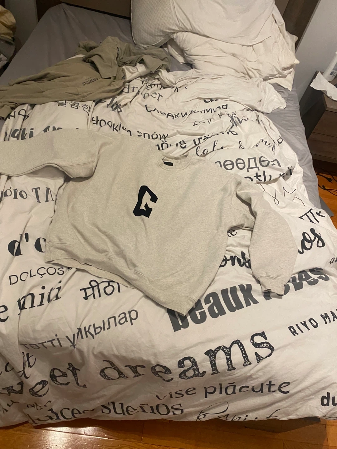 This is a light grey crewneck sweatshirt with a black 'G' logo on the chest. It appears to be made of a comfortable cotton blend. It's a classic crewneck style that's great for everyday wear.