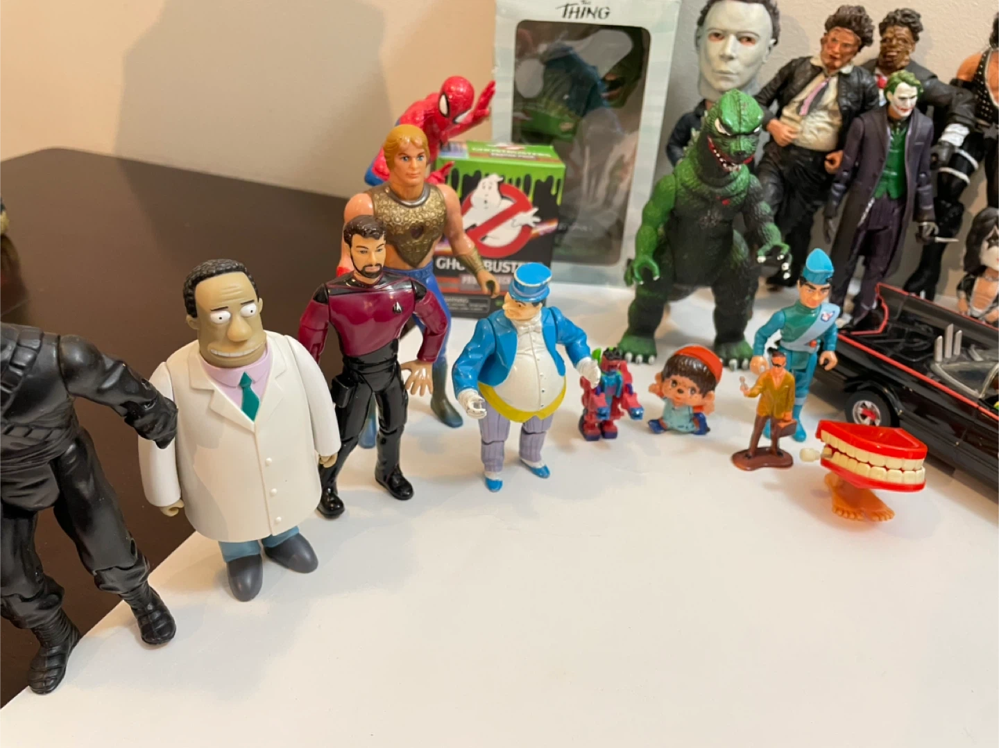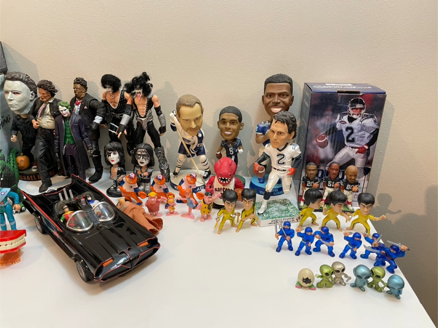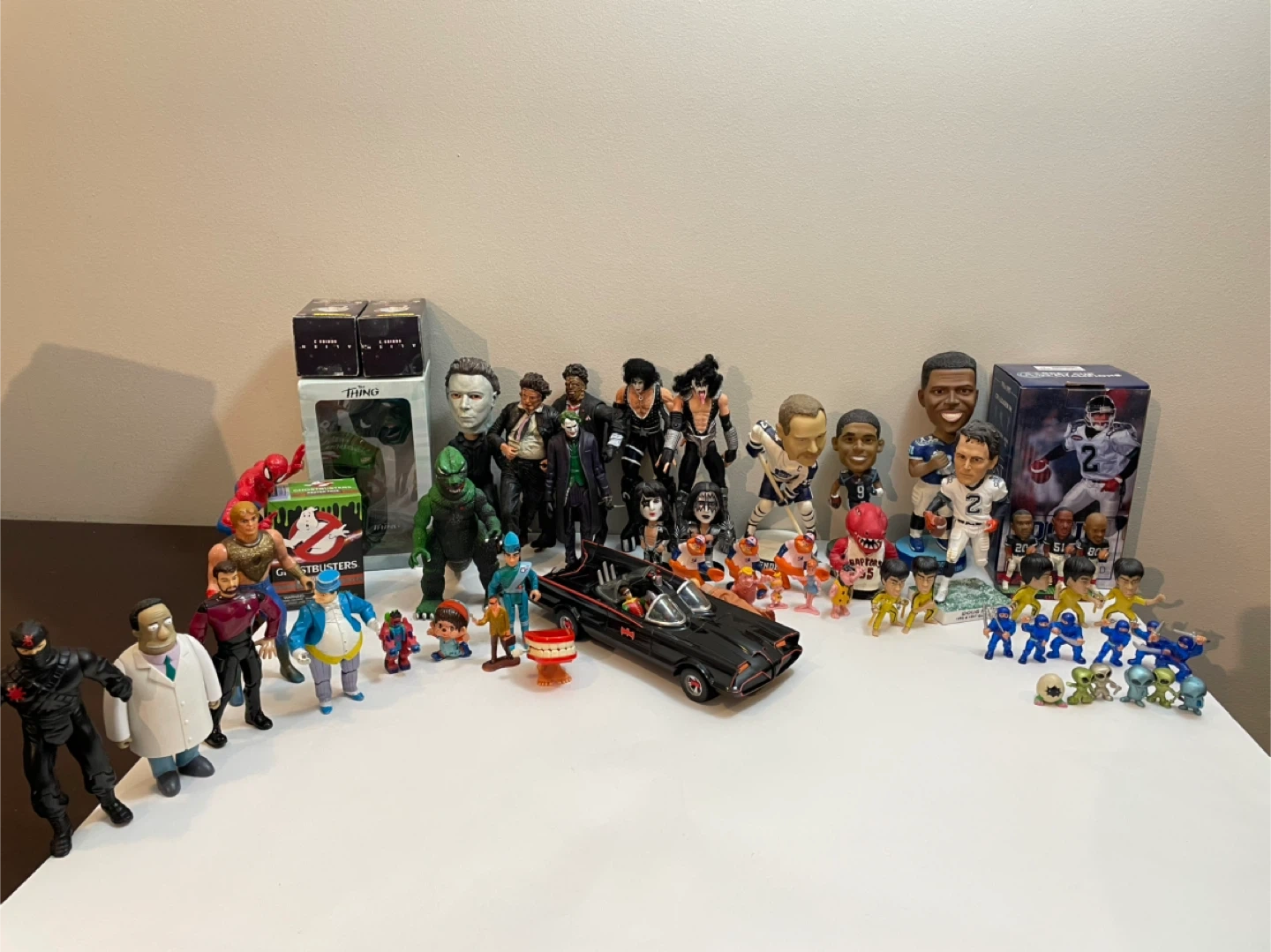 A collection of various action figures and collectibles including characters from movies, TV shows, and sports. Includes items like the Batmobile, Ghostbusters Proton Pack, and Bobbleheads. Many are in original packaging or have it nearby. 5$ and up .