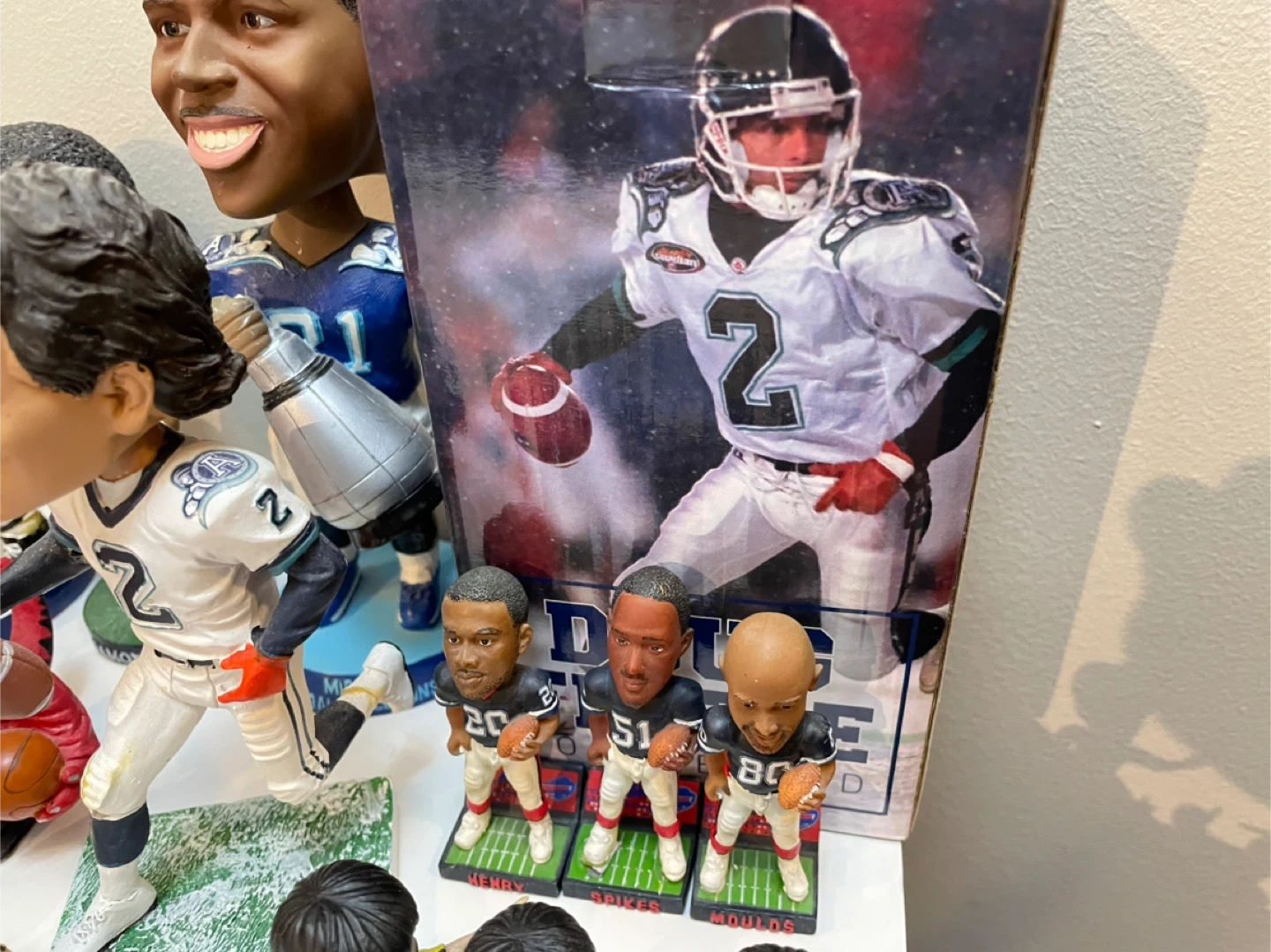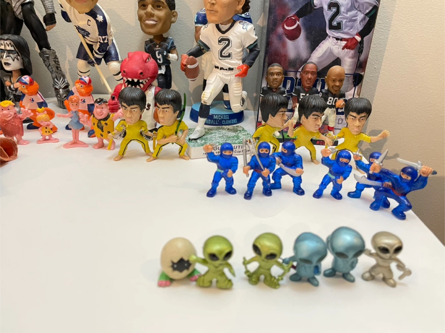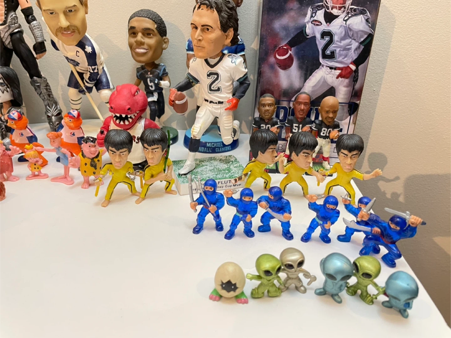 A collection of various action figures and collectibles including characters from movies, TV shows, and sports. Includes items like the Batmobile, Ghostbusters Proton Pack, and Bobbleheads. Many are in original packaging or have it nearby. 5$ and up .