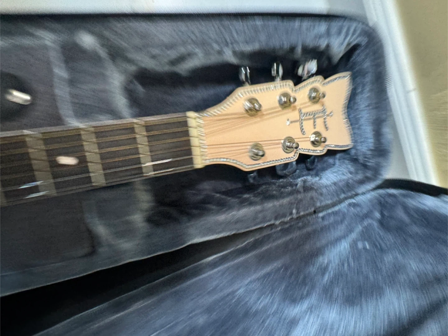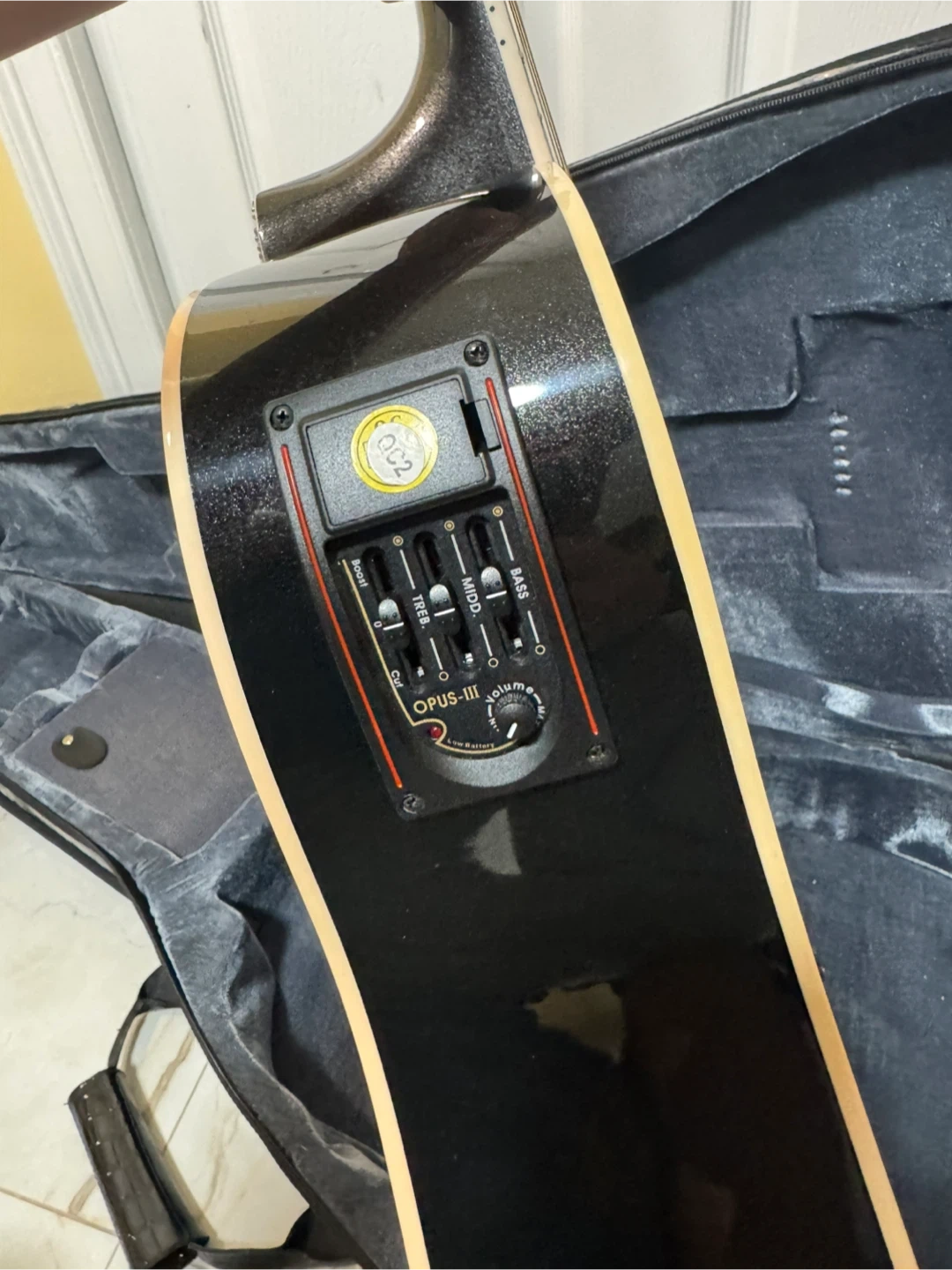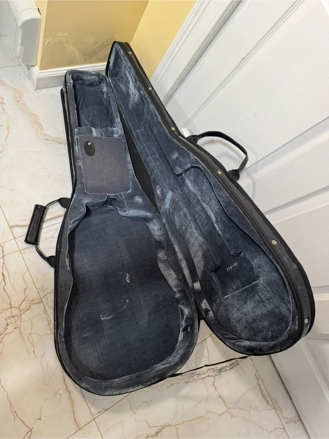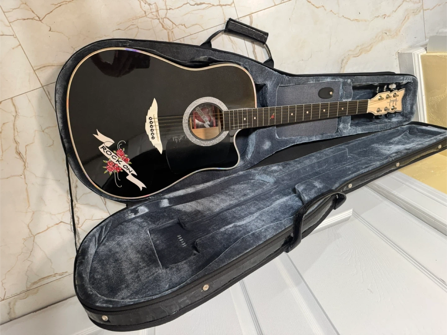 Black acoustic guitar with "Esteban" and "Crystal Heart" graphics. It's in a lined, hard-shell case. Ready to play!. Edición limitada y única. En perfectas condiciones.