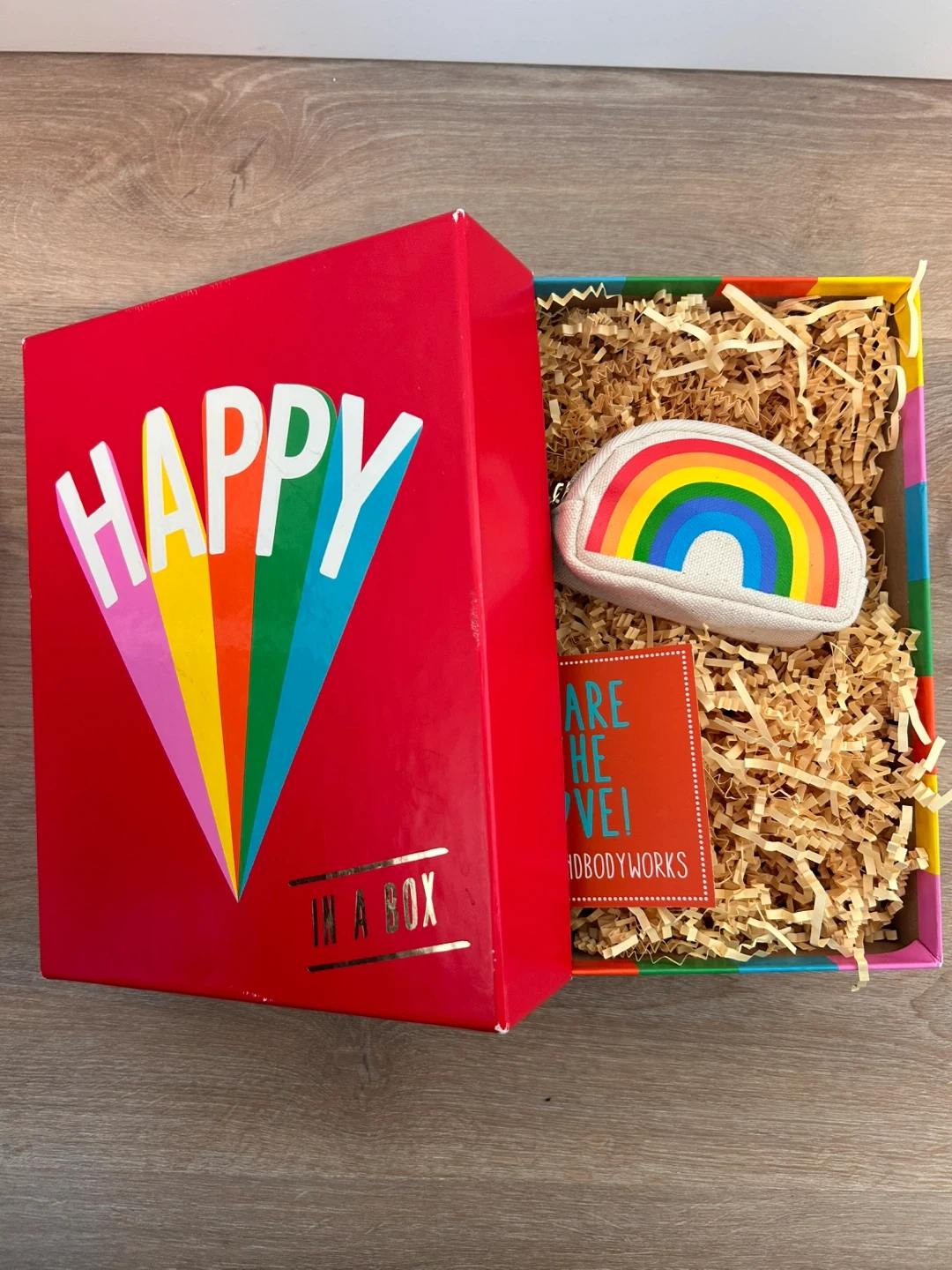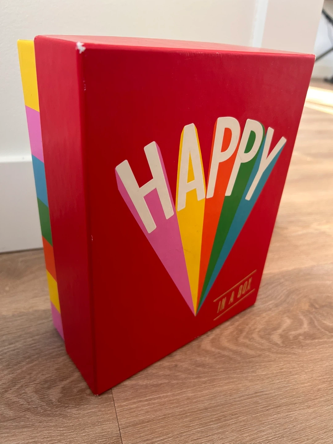 • "Happy In A Box" Collector’s Box: A sturdy, vibrant red gift box featuring the "Happy" rainbow sunburst design.
