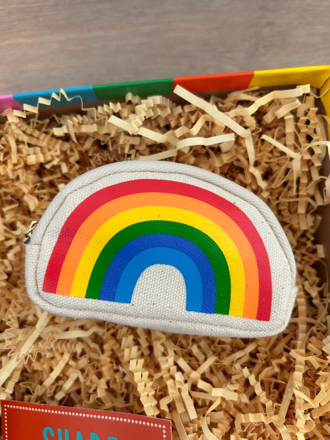 • Rainbow Canvas Pouch: A small, durable semi-circle zipper pouch with a bright rainbow print—perfect for coins, makeup, or small essentials.