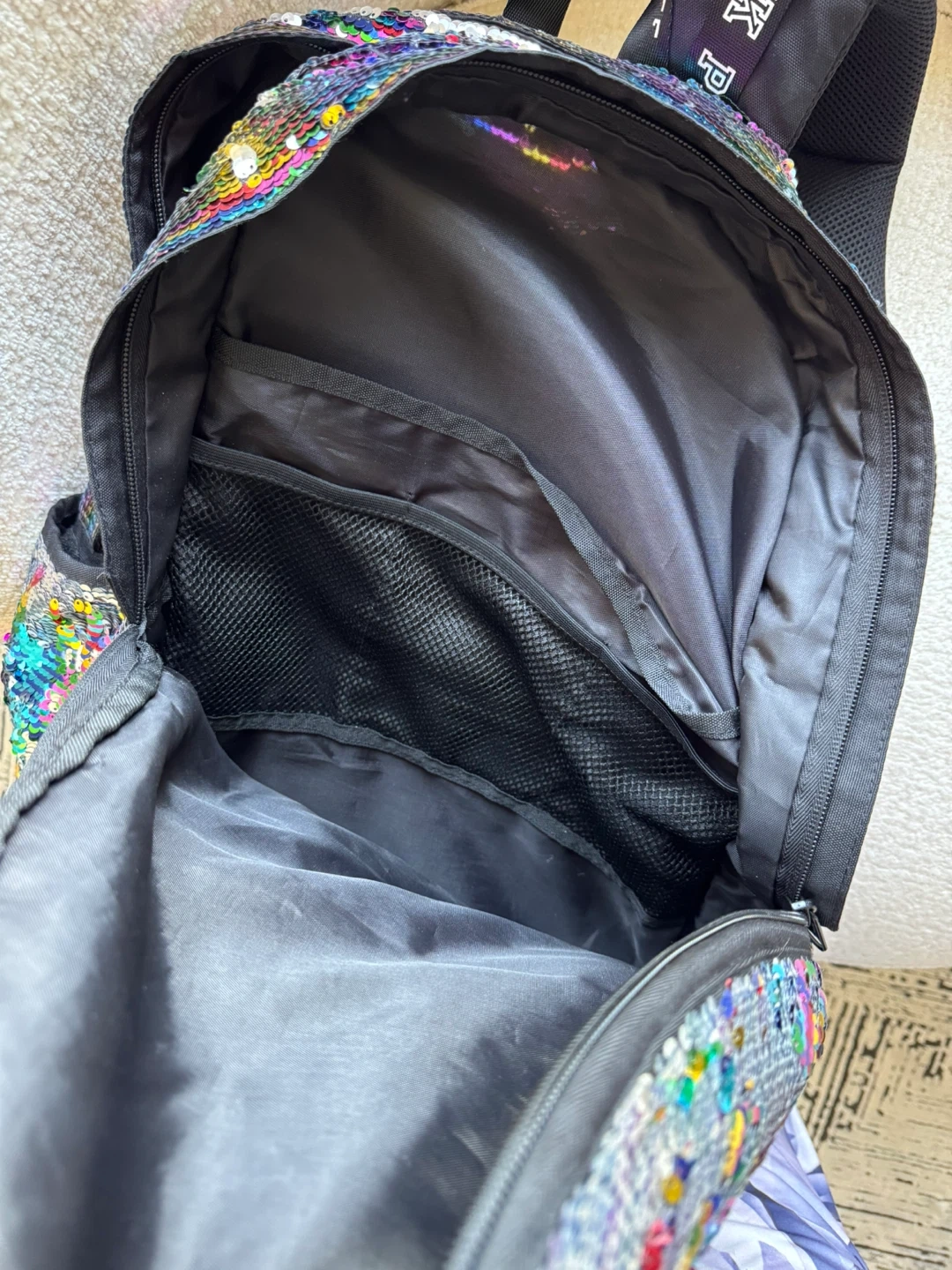 This backpack features vibrant rainbow and iridescent sequins. It has adjustable straps and a zippered main compartment. Perfect for school or everyday use!