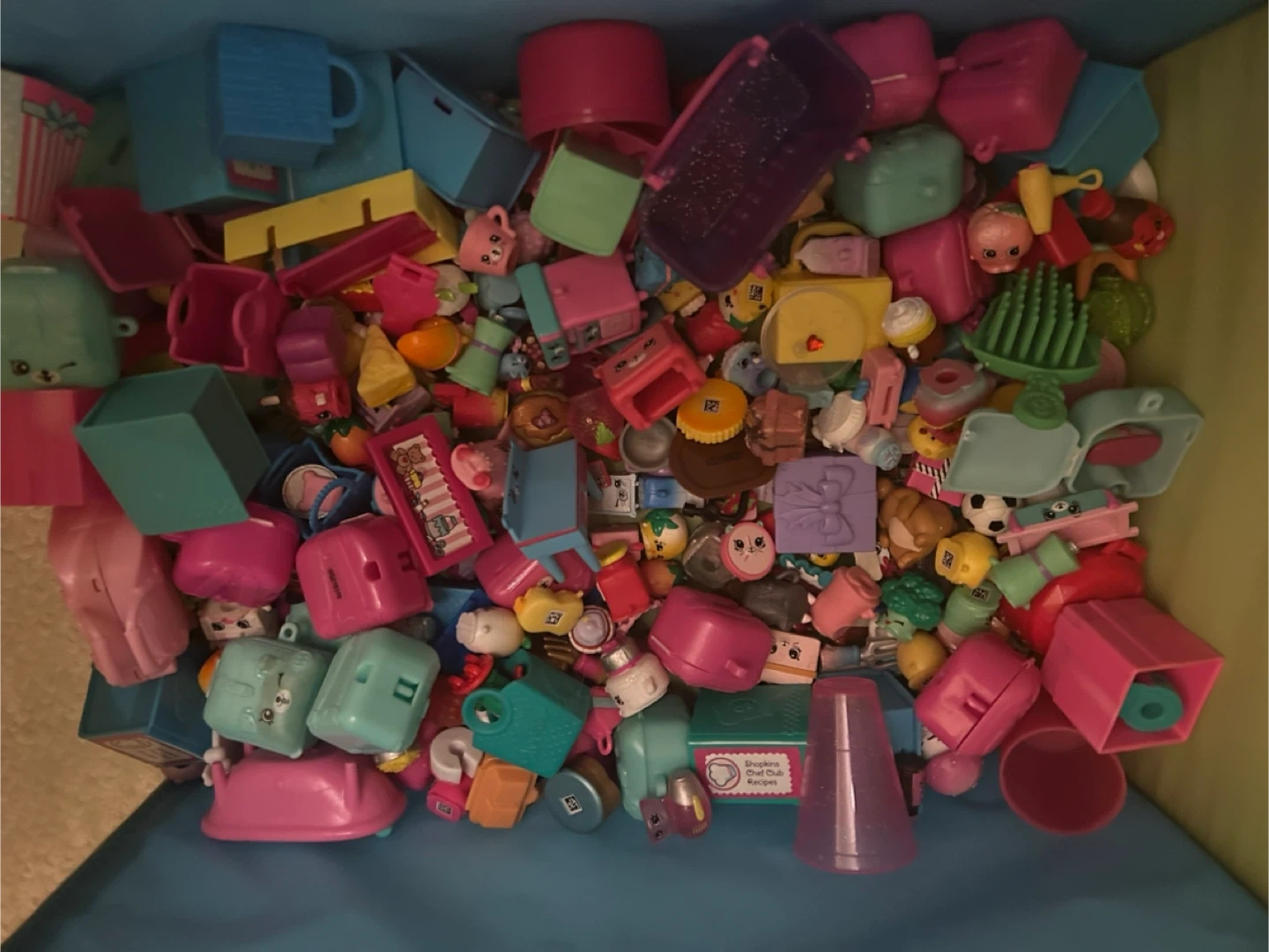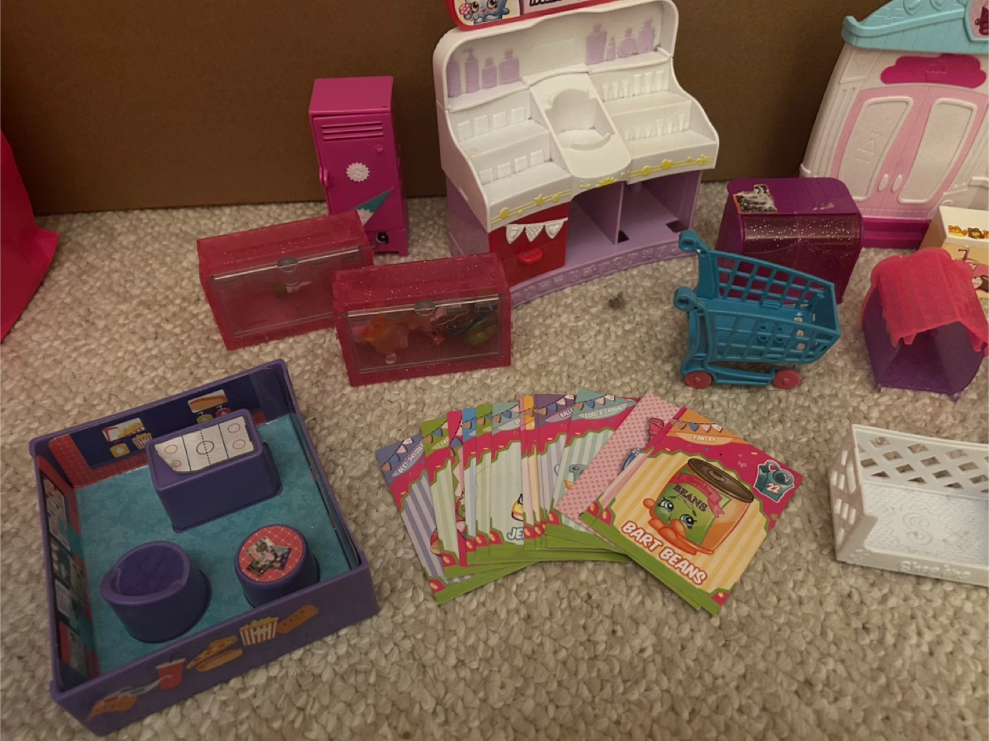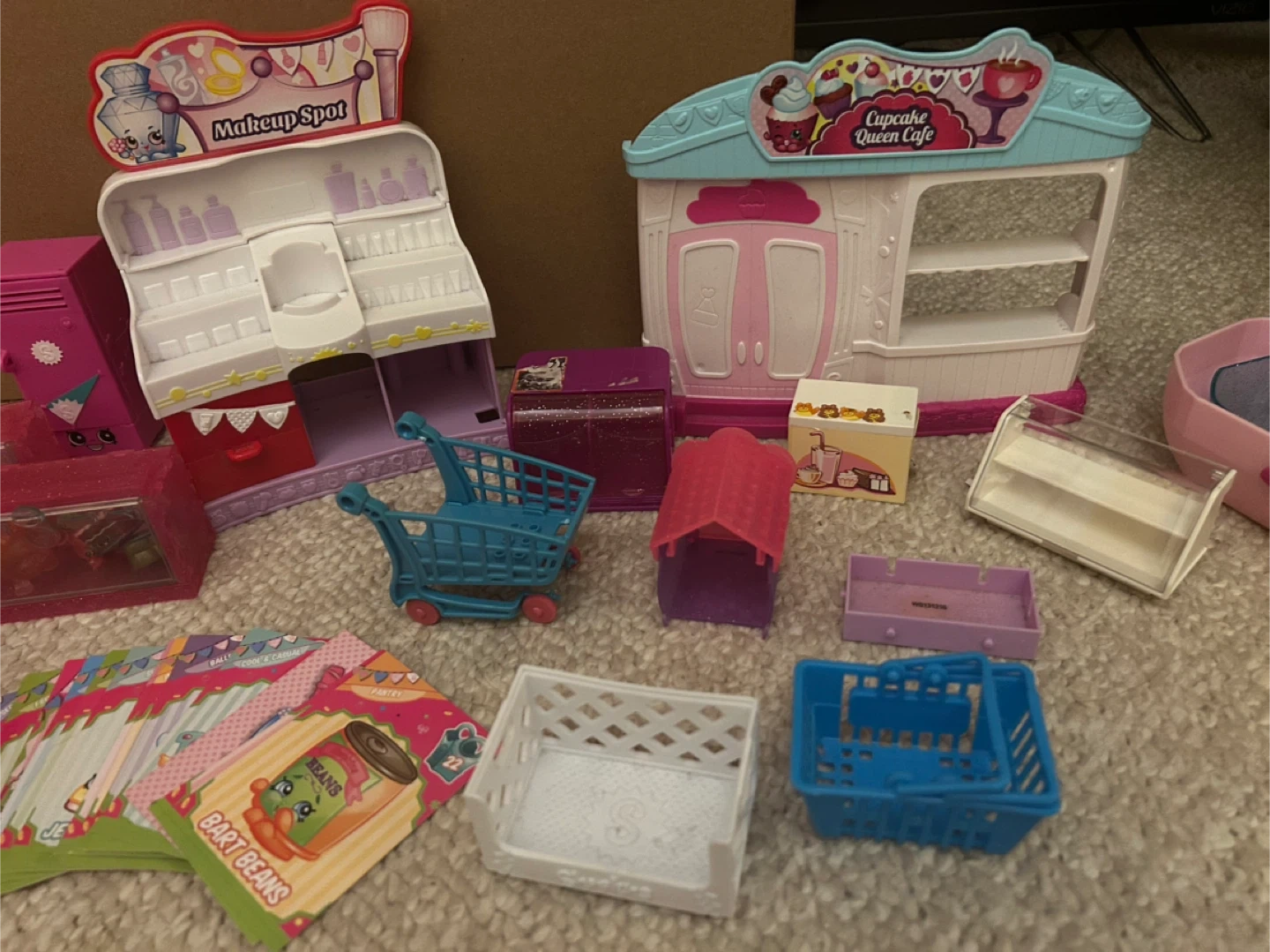 A collection of Shopkins playsets, including "Makeup Spot" and "Cupcake Queen Cafe", along with various accessories and storage cases. This lot includes miniature shopping carts, lockers, display shelves, and collectible cards. Great for imaginative play!