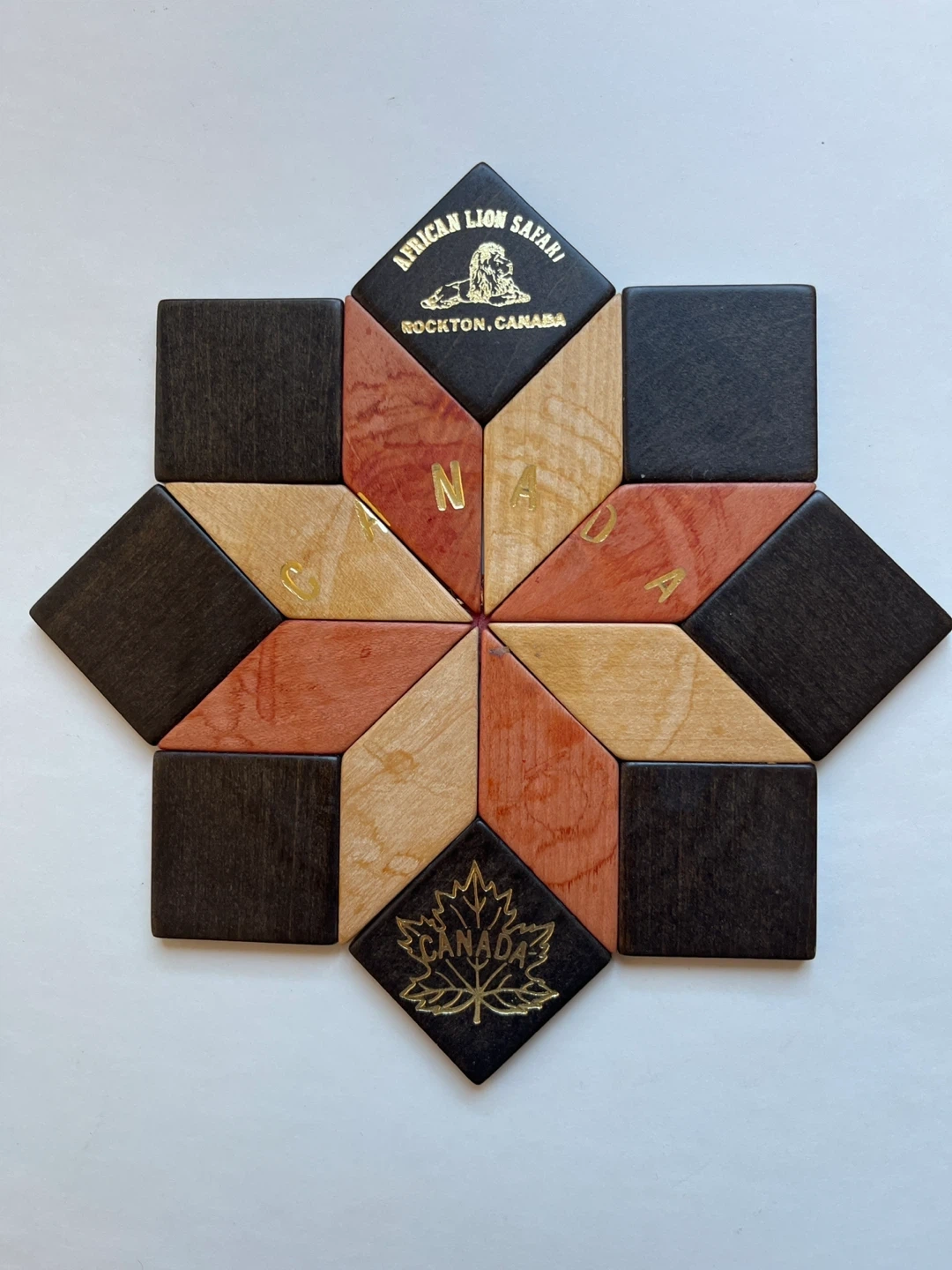 This wooden trivet features a starburst design with "CANADA" and "ROCKTON, CANADA" text. It also includes a gold embossed maple leaf and a lion image with "AFRICAN LION SAFARI" text. It's a nice piece of Canadian-themed decor.
