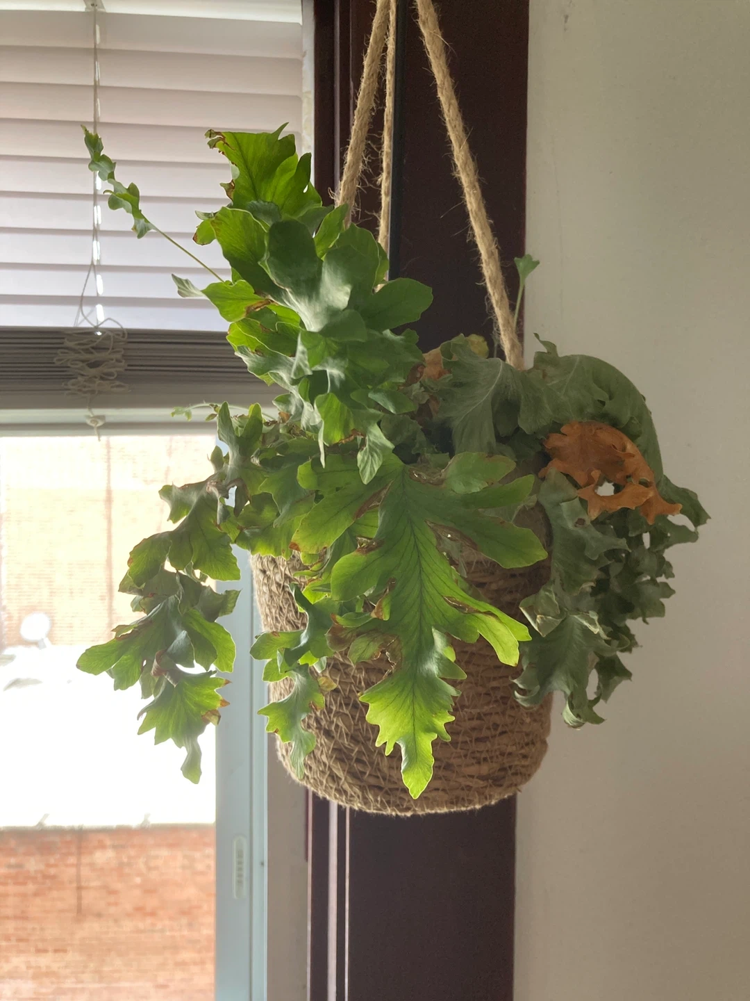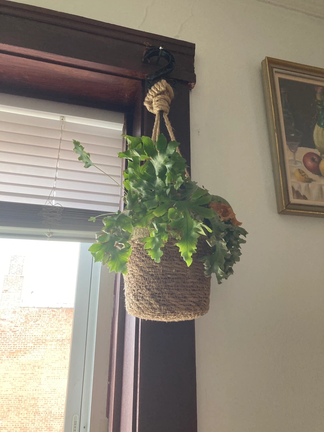 This is a lush, green hanging plant in a woven basket. It's a unique piece that brings life to any room. The plant appears healthy and vibrant. It's ready to be displayed!