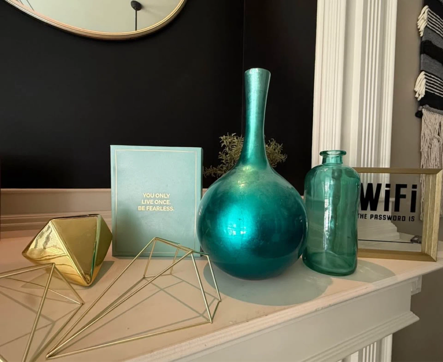 A large, teal vase with a metallic sheen. Its round shape and narrow neck make for a stylish statement piece. Perfect for adding a pop of colour to your decor! PLUS other coordinating decor price includes all