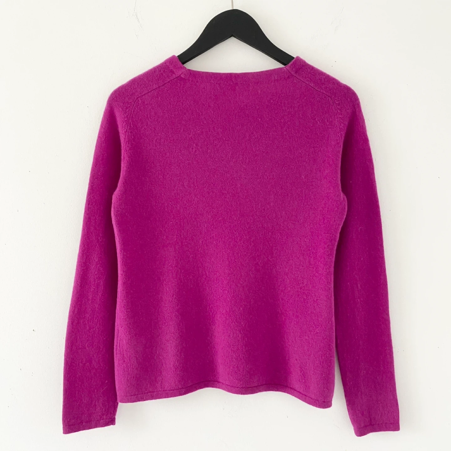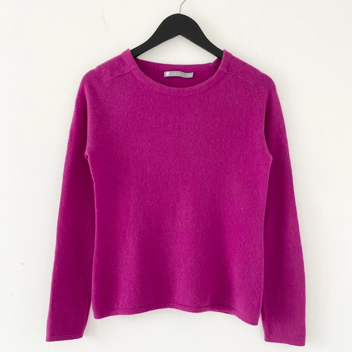 InCashmere raglan crew / boat neck sweater. Made of lightweight 100% cashmere in a magenta colour. It's incredibly soft, cozy and luxe. I don't find it itchy but it's subjective. Can be worn many seasons. Love wrapping it around the neck as a scarf. There's no staining, pilling or damage. It's clean and in excellent condition.