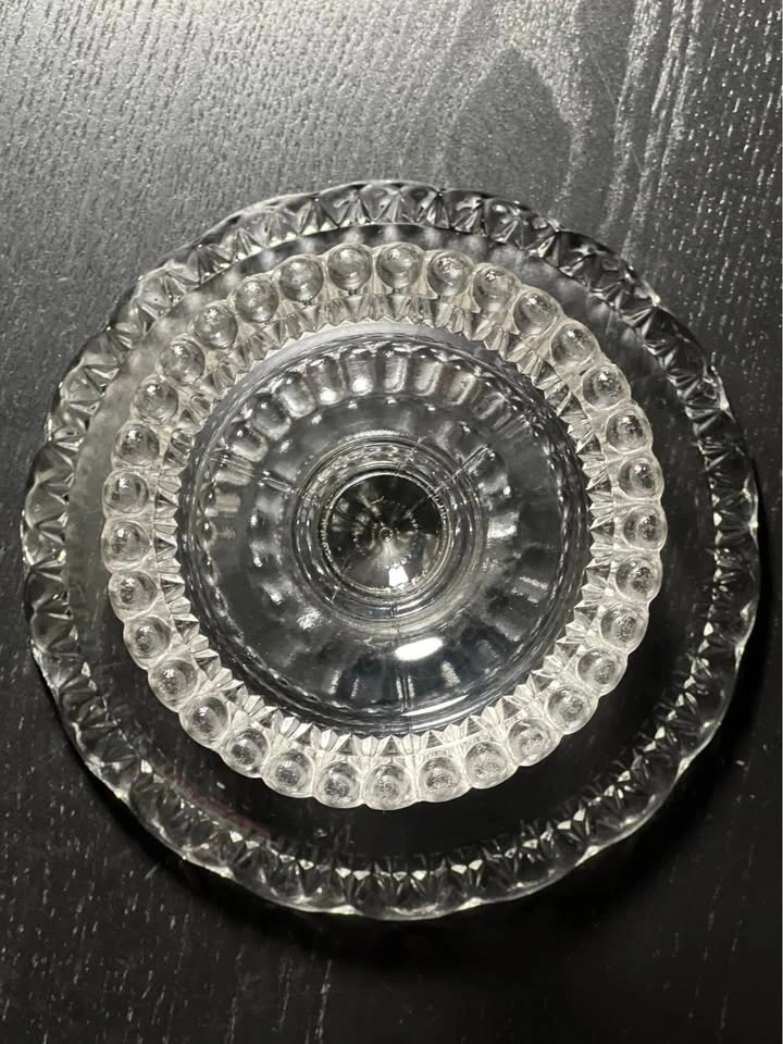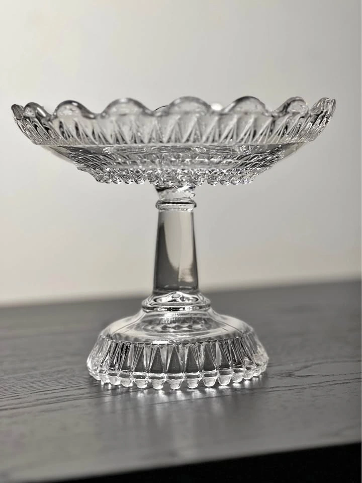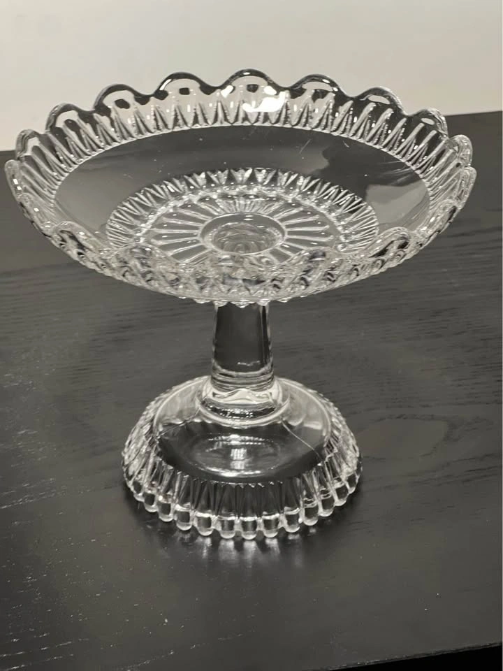 This is an antique Early American Pattern Glass (EAPG) open compote in the Fulton pattern, also known as Martha's Tears. The pattern was introduced around 1889. It features a scalloped or sawtooth rim and a design often referred to as "Noonday Sun" or "Saw Tooth Bottom" on the base. Made of clear, heavy-weighted pressed glass. EAPG items are highly collectible antique glass pieces. Compotes were traditionally used for serving fruits, candies, jellies, or desserts, and are popular today for centerpieces or general decor. Measurements approximately: 5.75β in height and 6.75β in diameter. Pre-owned. Pickup is 58th and 7th Ave in midtown Manhattan.