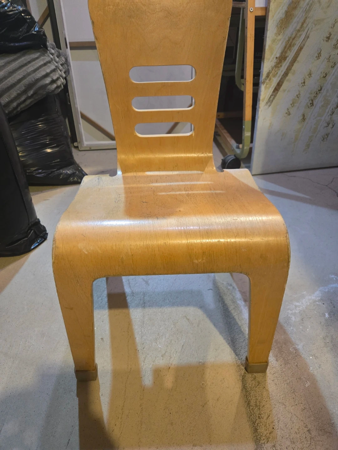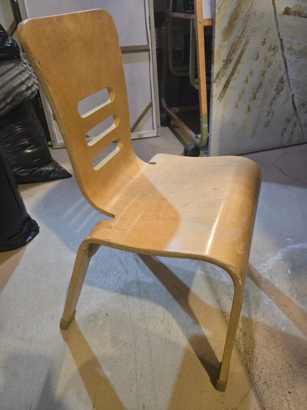 This is a bentwood children's chair with a slatted back. It's made of light-coloured wood. Perfect for a playroom!