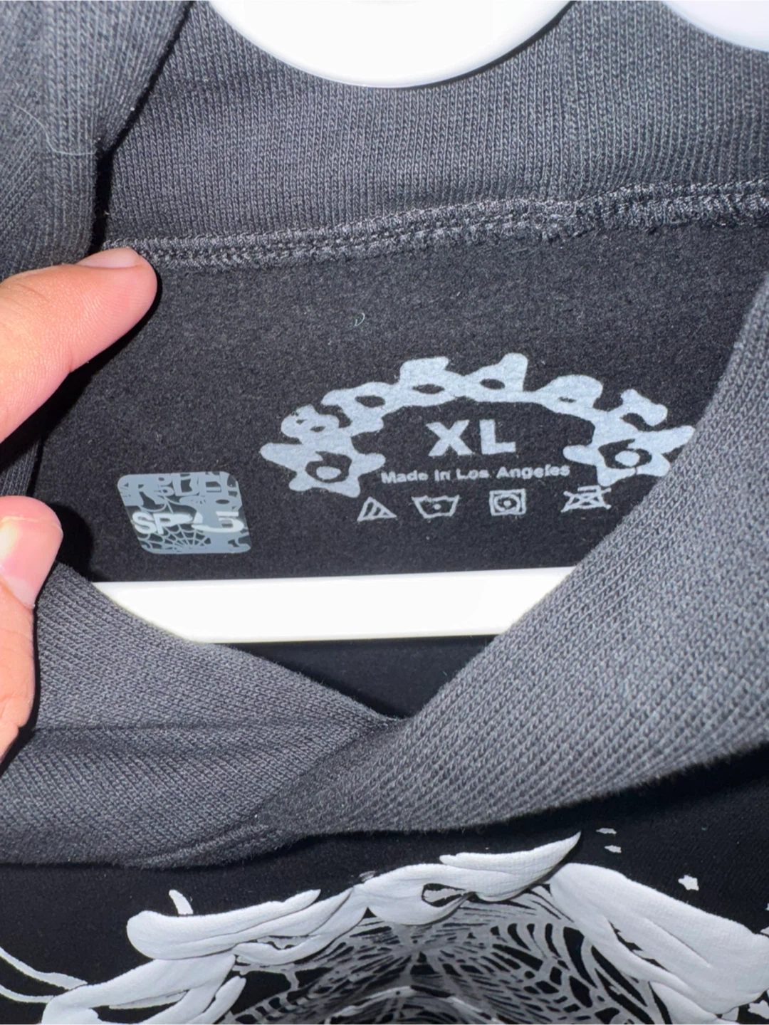 This is an Authentic black SP5DER hoodie in size XL. It's made in Los Angeles and features a spiderweb graphic on the front. I bought originally from StockX for my dad but he dosent like the design. It can fit size L too.