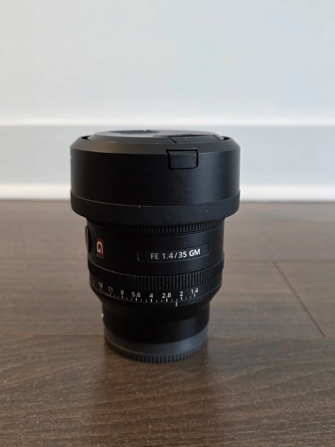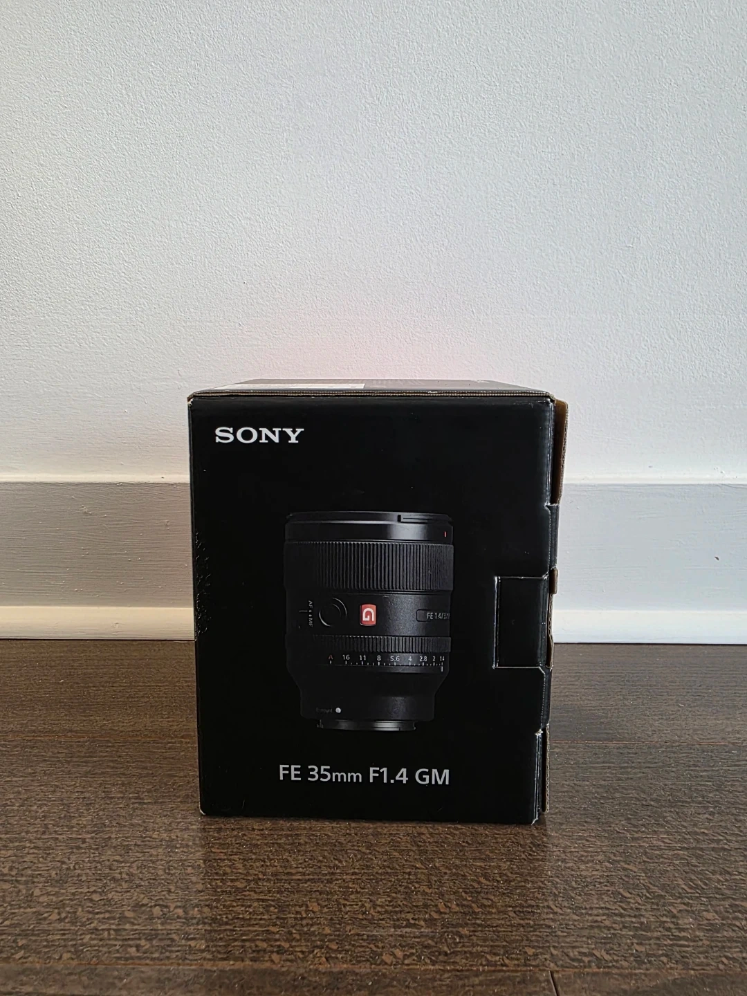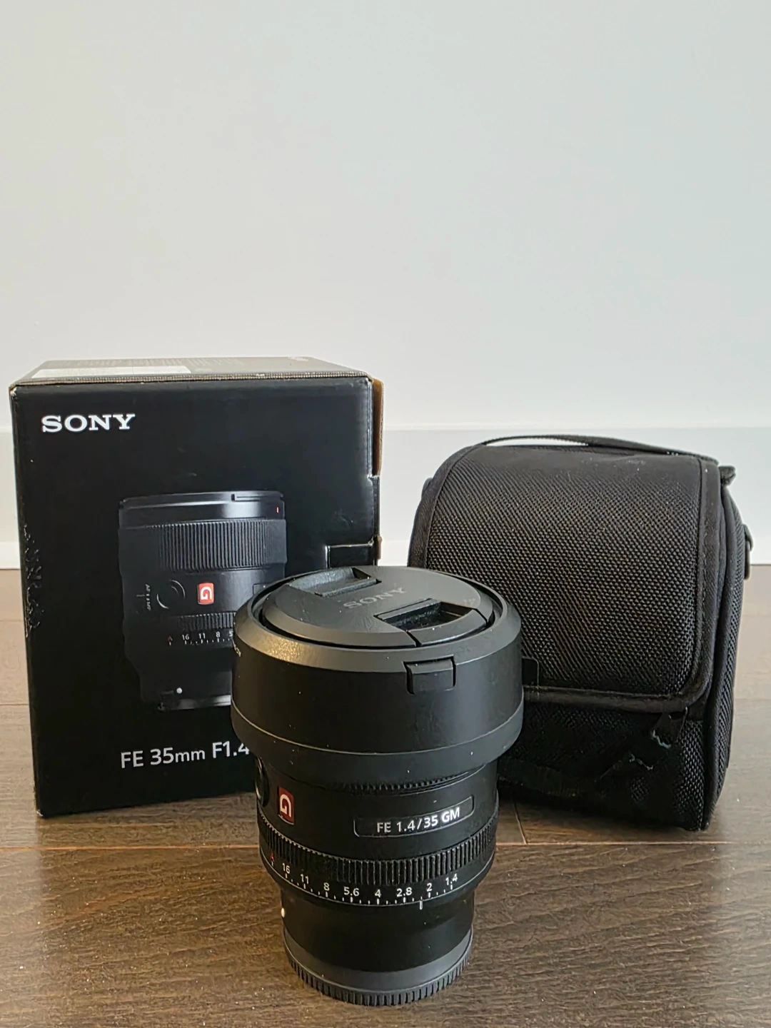 This is a Sony FE 35mm F1.4 GM lens. It includes the original box and a lens pouch. Aperture range from F1.4 to F16.