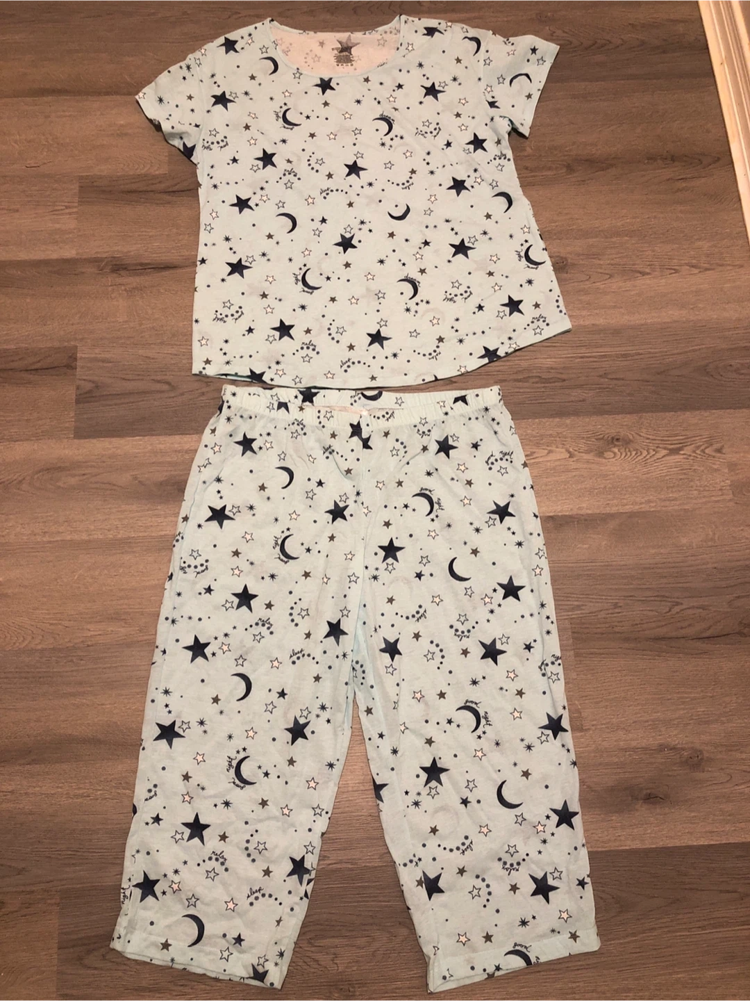 Comfortable light blue pajama set with a charming all-over print of stars, moons, and constellations. Made from soft fabric for a cozy night's sleep. Includes a short-sleeved top and cropped pants.