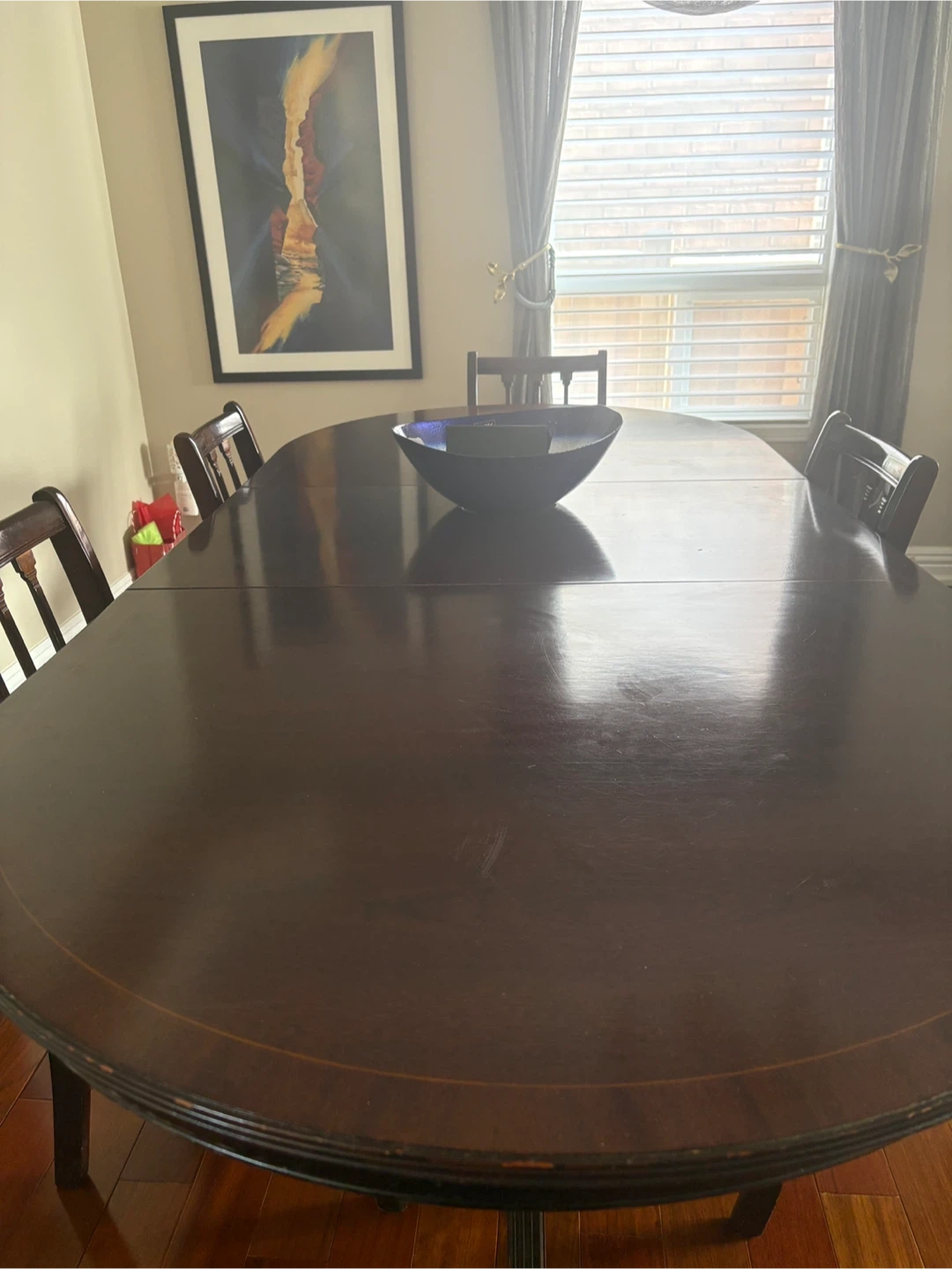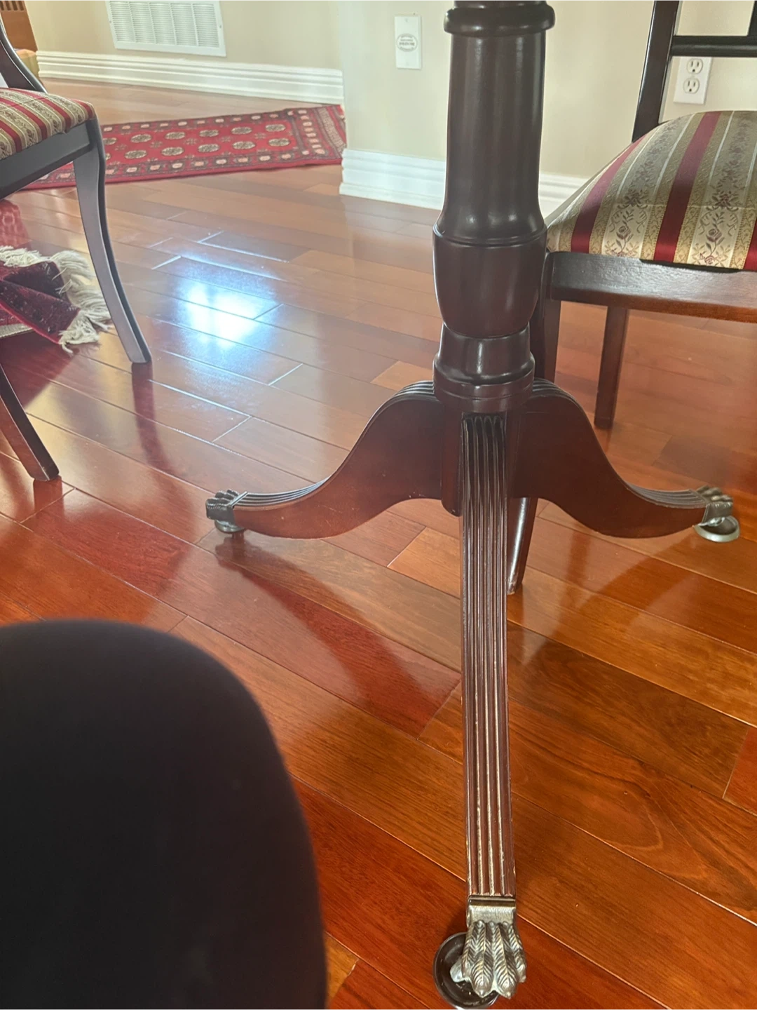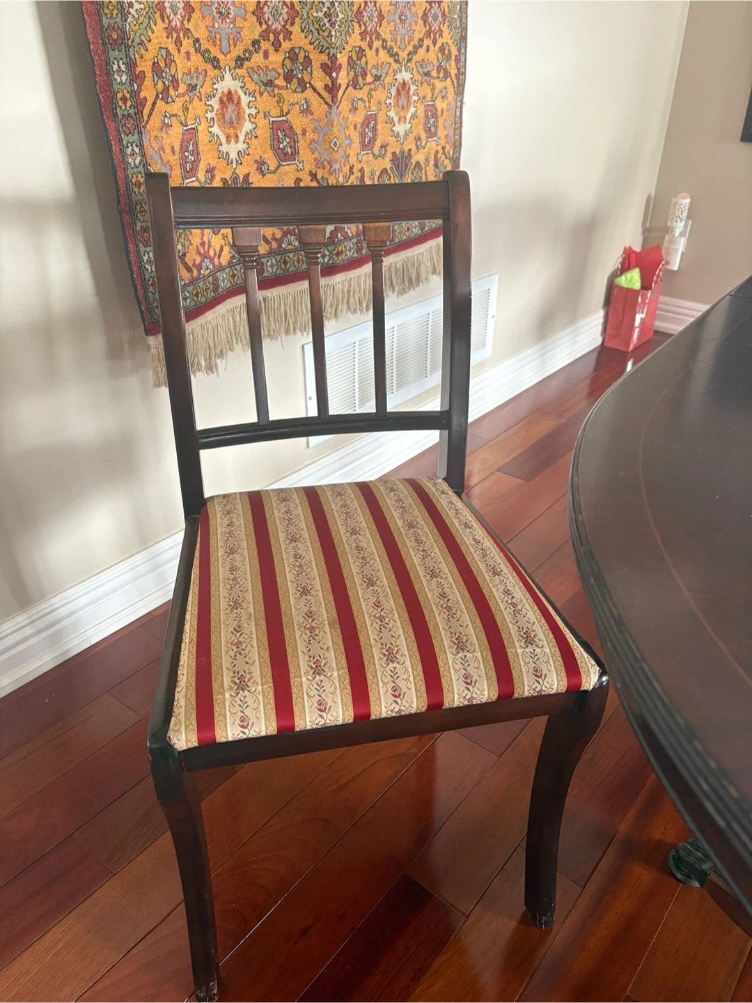 This dining chair features a dark wood frame and a seat upholstered in a red, cream, and gold striped fabric. It's a classic design that would complement a formal dining room. The chair's construction is solid, and it's ready to be used at your dining table. 2 chairs need to be re glued. Pick up in Whitby