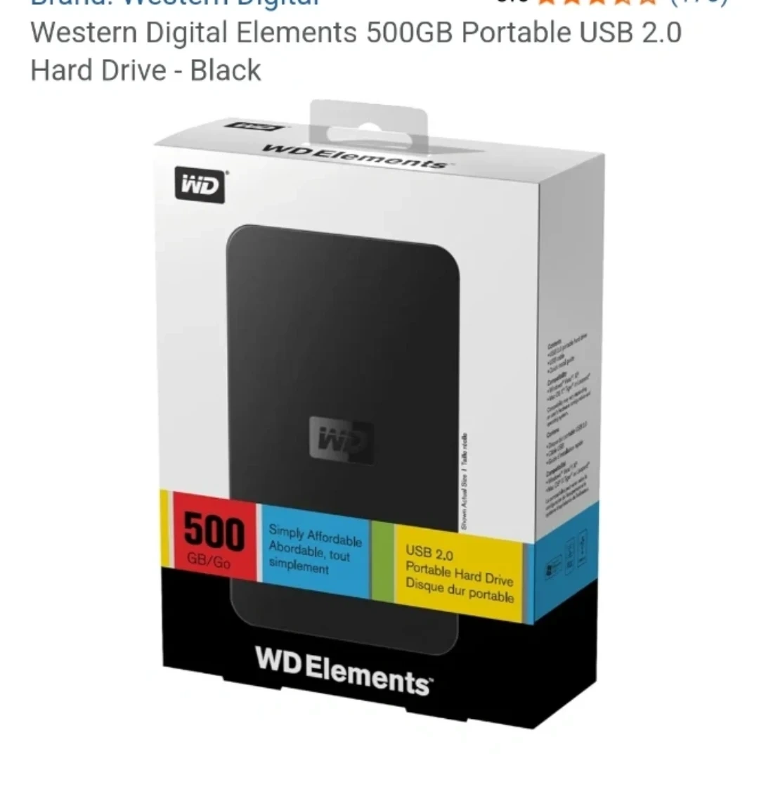 This is a WD Elements 500GB portable USB 2.0 hard drive in black. It's a compact storage solution for your digital files. The drive uses USB 2.0 connectivity for data transfer.