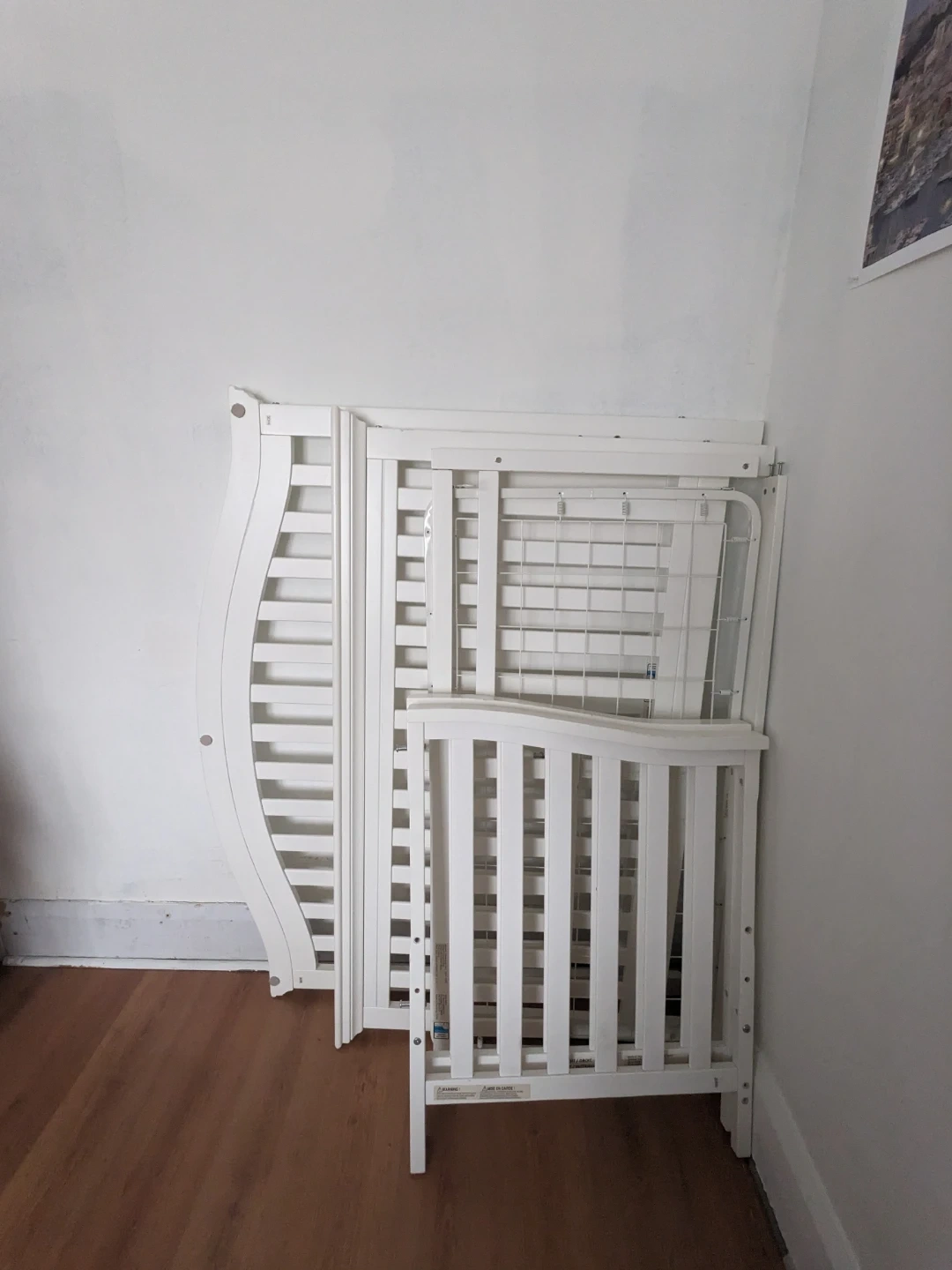 Suite bebe full sized crib (white). Currently disassembled. Had the option to be converted to toddler or full sized bed!