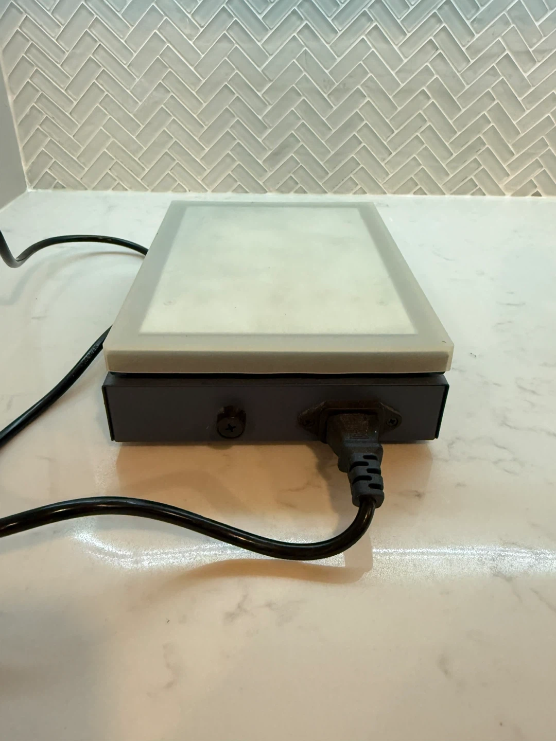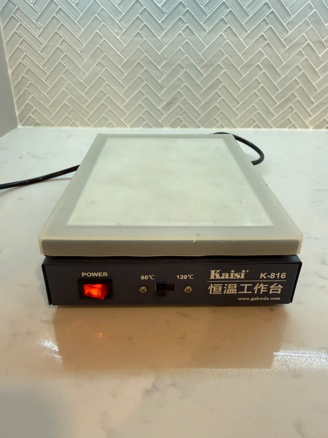 This Kaisi K-816 heating plate provides stable temperature control for various uses. It offers two temperature settings, 80°C and 120°C, powered by a standard electrical cord. The heating surface is approximately 9 inches by 5.5 inches.