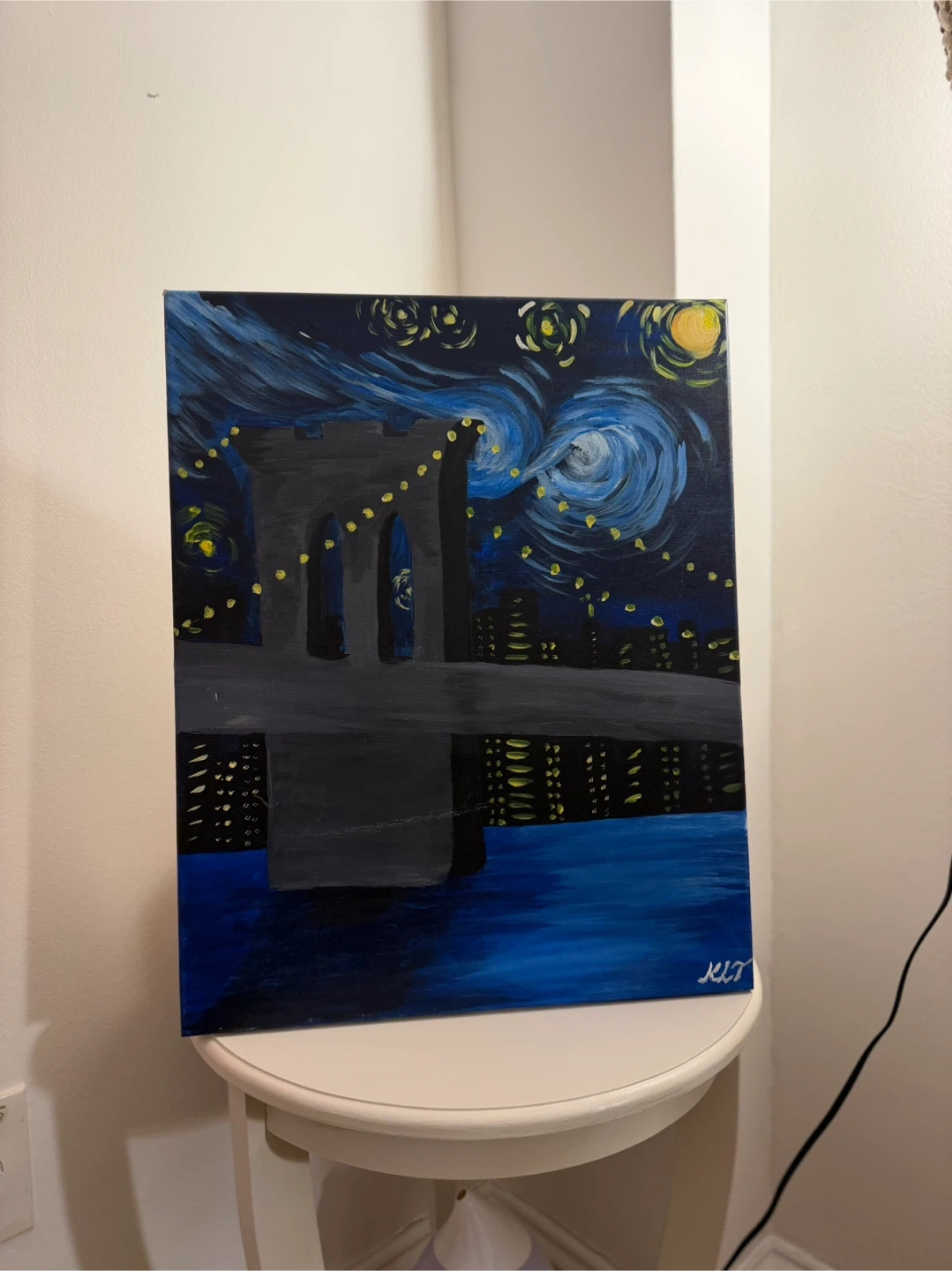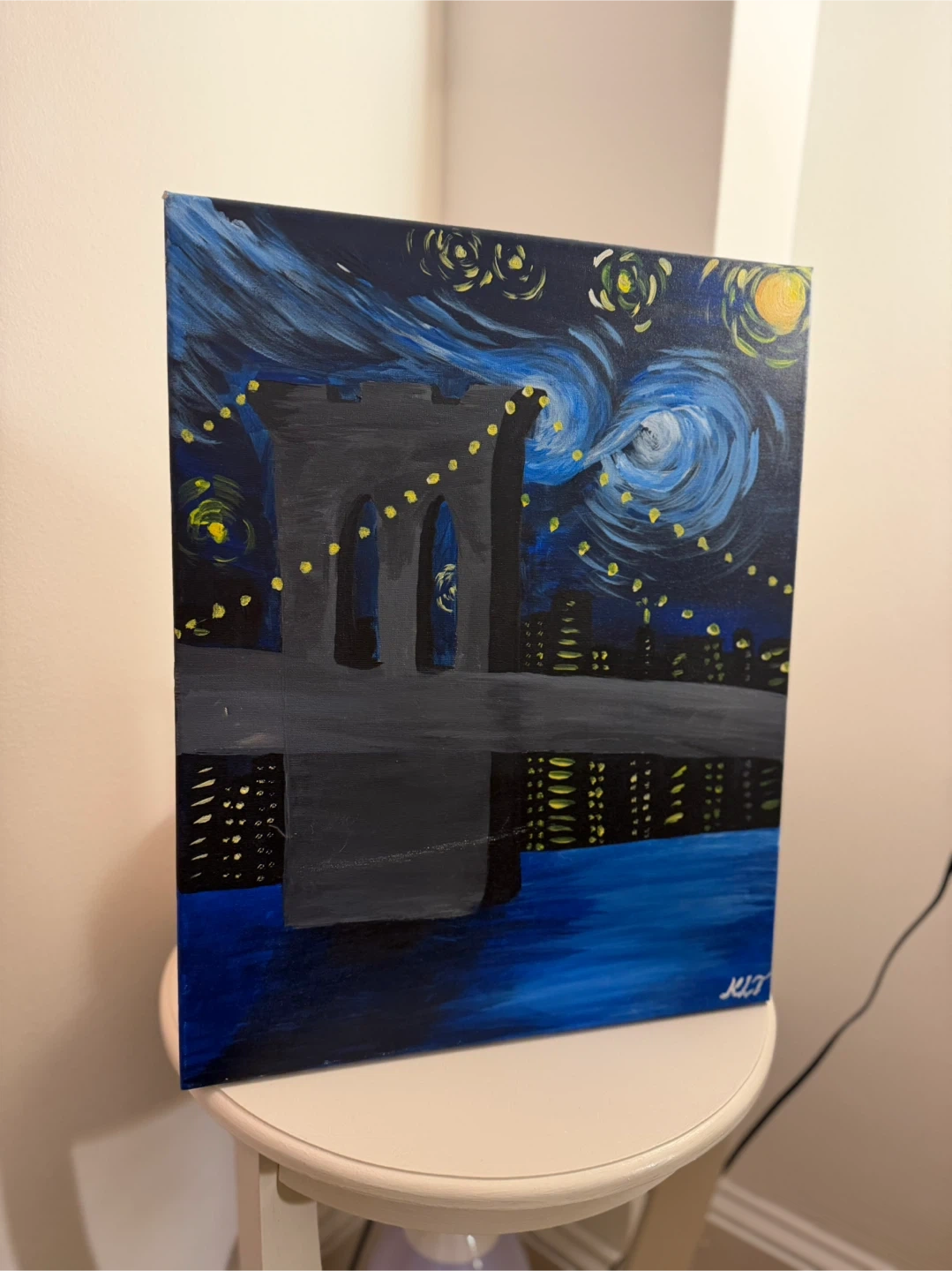 Acrylic painting of the Brooklyn Bridge with a starry night sky. Features a dark canvas with blue, black, gray, and yellow acrylic paints. Hand-painted.