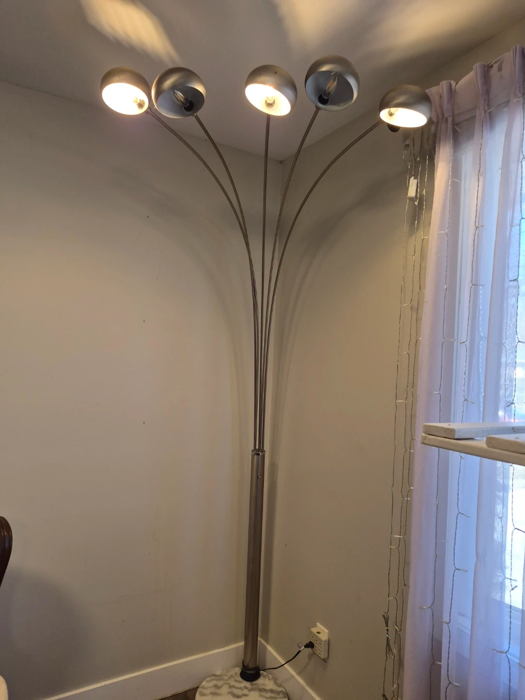 This is a silver arc floor lamp with five adjustable lights. It has a marble base for stability. The lamp's arc design is great for lighting up a reading nook or a seating area without needing multiple lamps.