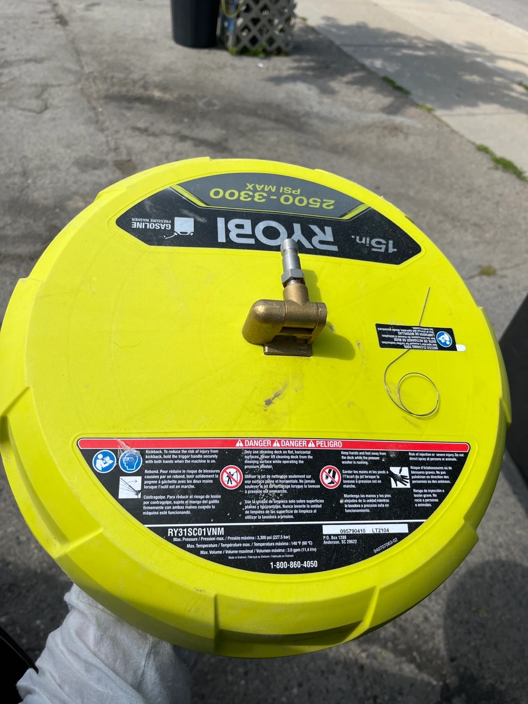 119Selling a Ryobi 15-inch surface cleaner for pressure washers. It's designed for gasoline pressure washers with a PSI range of 2500-3300. It helps to reduce kickback and clean surfaces quickly!