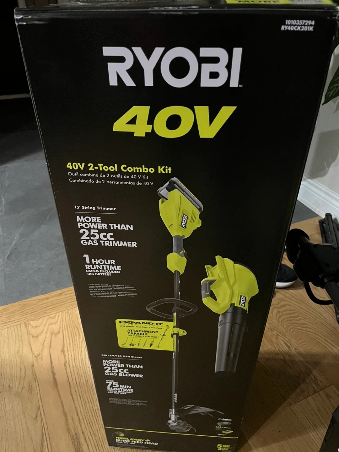 Selling a brand new Ryobi 40V 2-Tool Combo Kit, still in its original packaging! This kit includes a 15" String Trimmer and a 550 CFM/120 MPH Blower. The trimmer is more powerful than a 25cc gas trimmer, and the blower is more powerful than a 25cc gas blower. It features a 1-hour runtime using the included 4Ah battery for the trimmer, and a 75-minute runtime for the blower. Also includes an Expand-It attachment capable head and a Reel Easy+ bump feed head