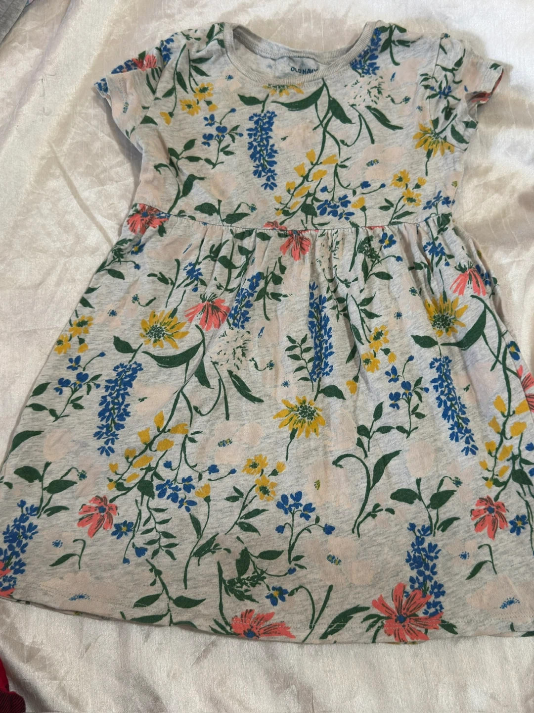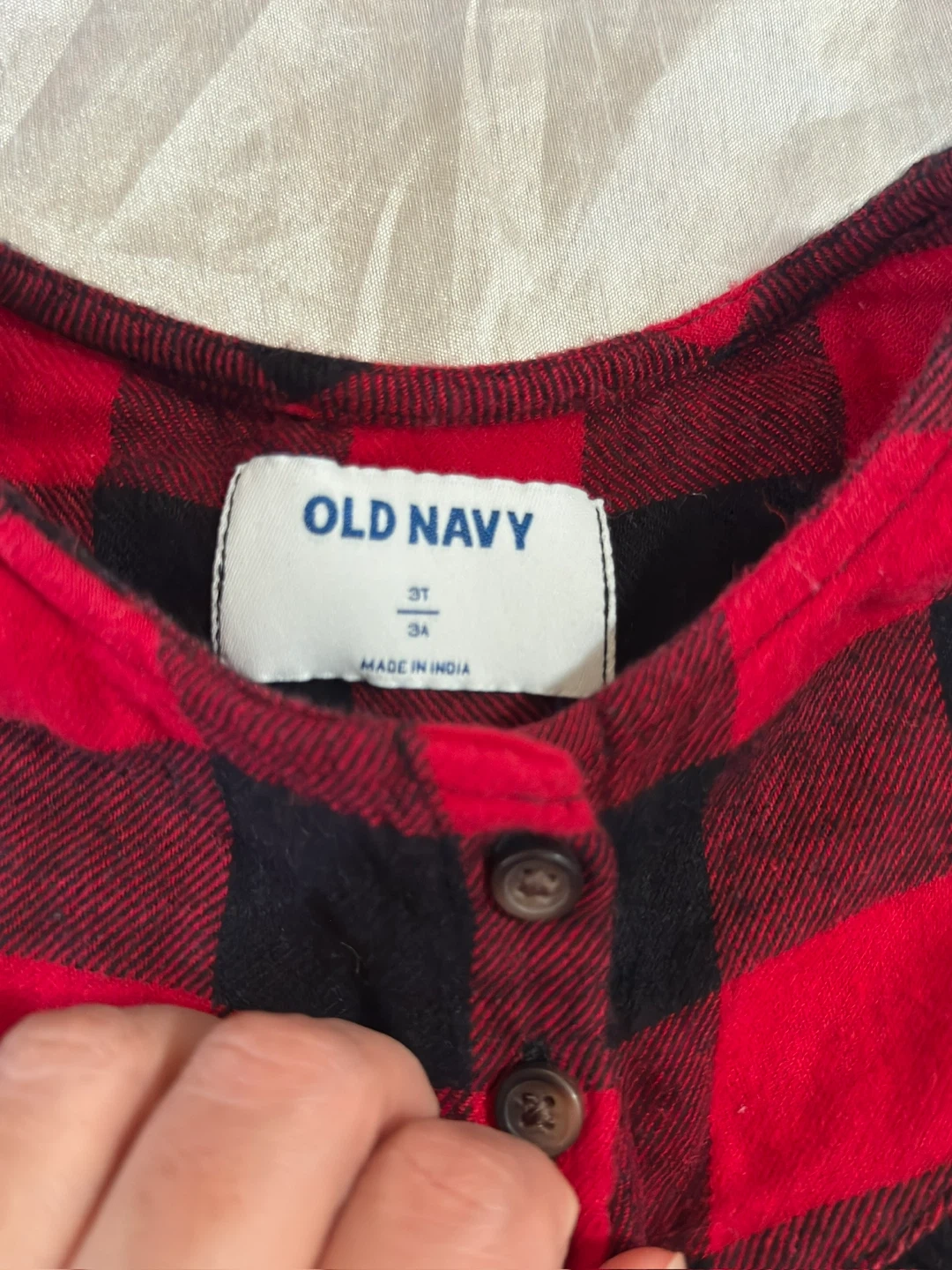 This Old Navy dress features a classic red and black buffalo plaid pattern. It's a size 3T with a button-up detail at the neckline and long sleeves. It's made of soft material, perfect for everyday wear.