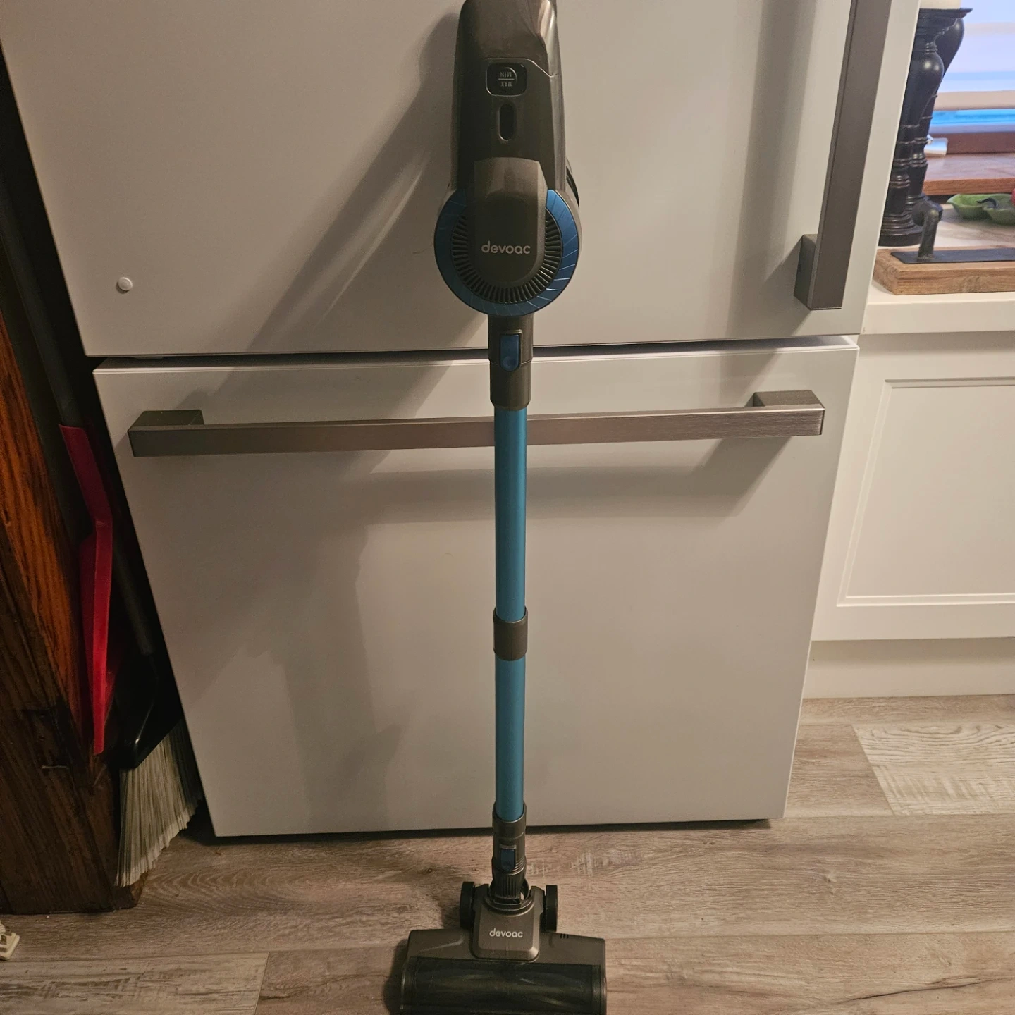 This DEVOAC cordless stick vacuum is blue and grey. It comes with multiple attachments for versatile cleaning. This vacuum is great for quick cleanups around the house! Comes with charger and from smoke and pet free home.