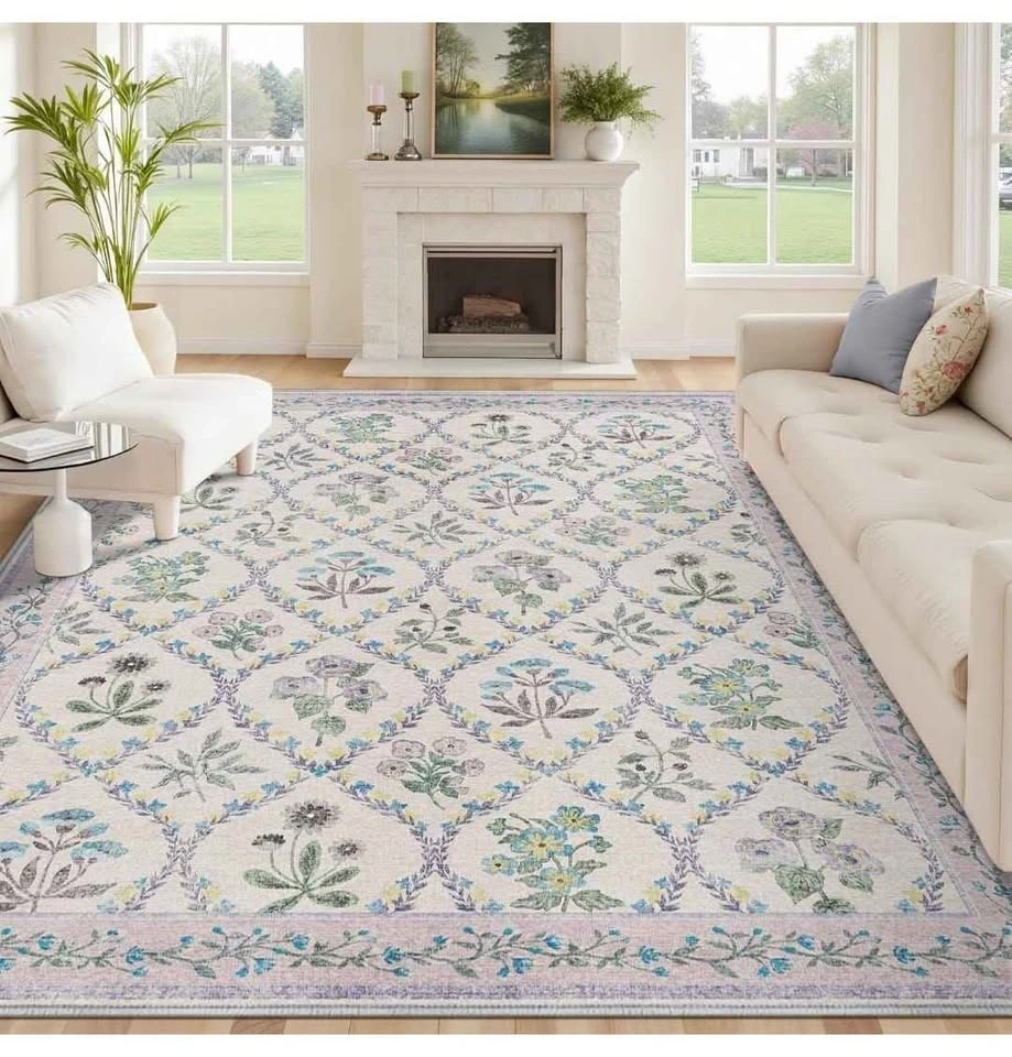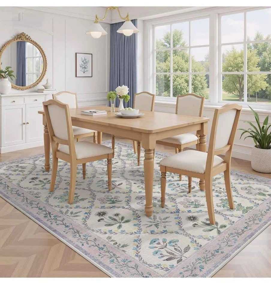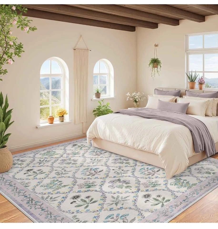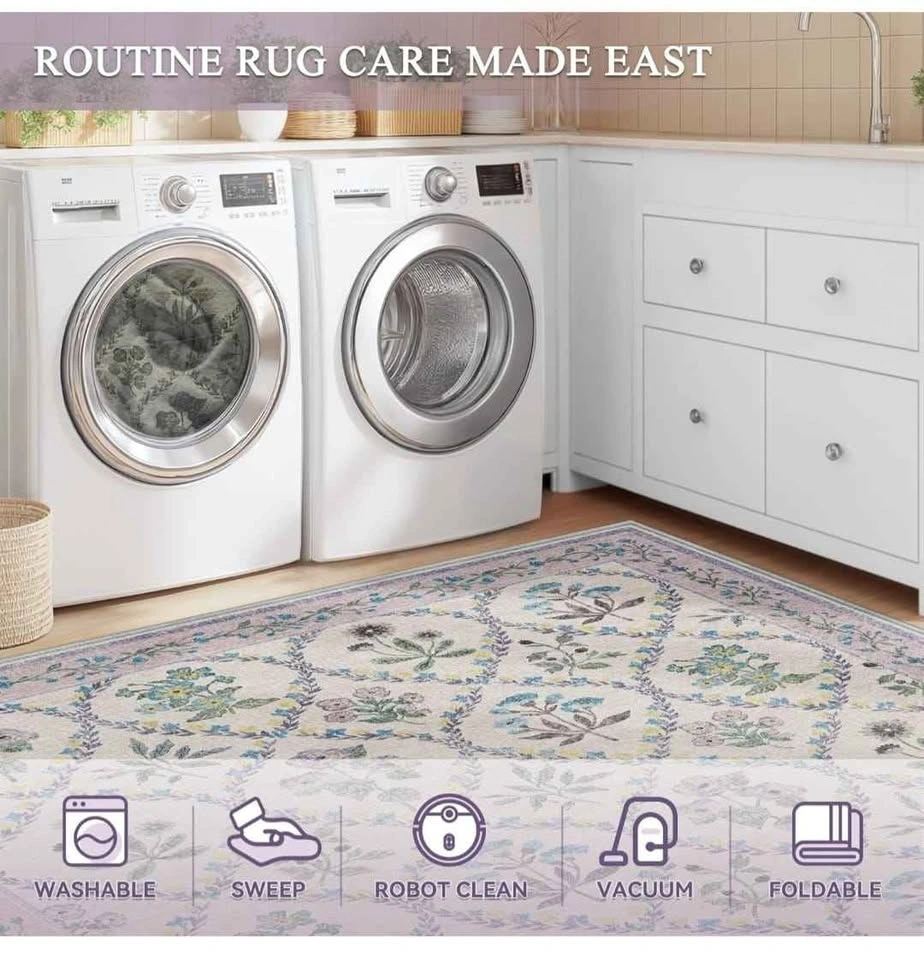Brand new 8x10 washable area rug. Perfect for living room, bedroom, dining room, kitchen, office, or nursery. Features a boho floral vintage design in purple and grey. Low pile, soft, thin, and non-slip.