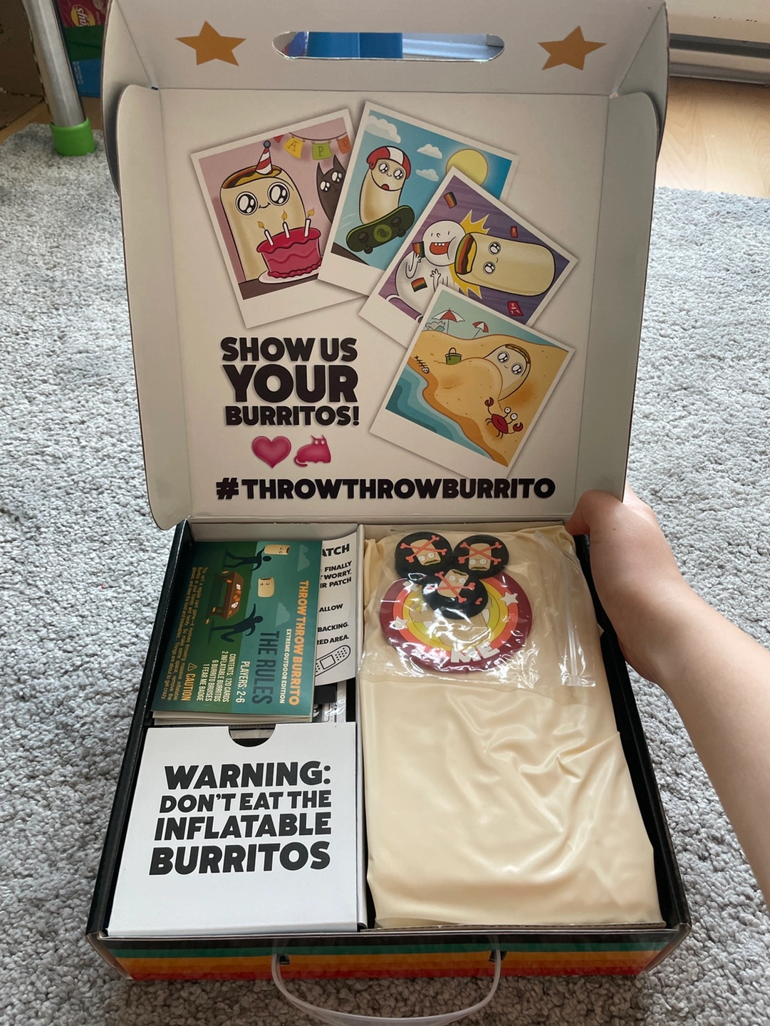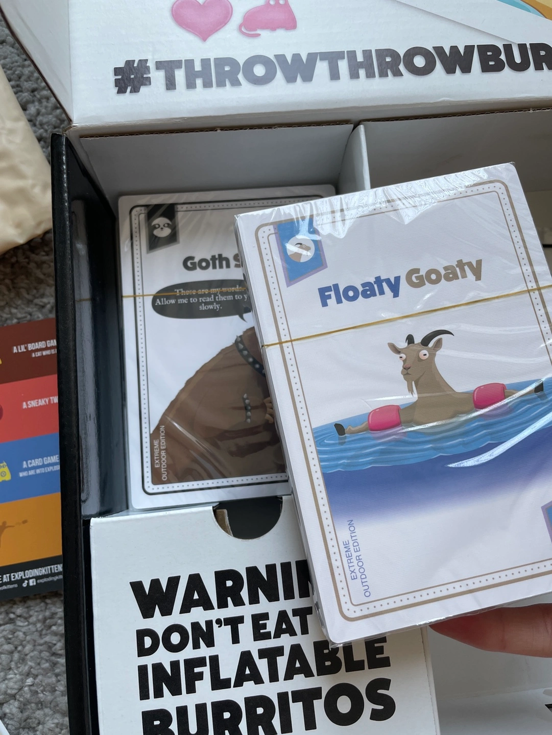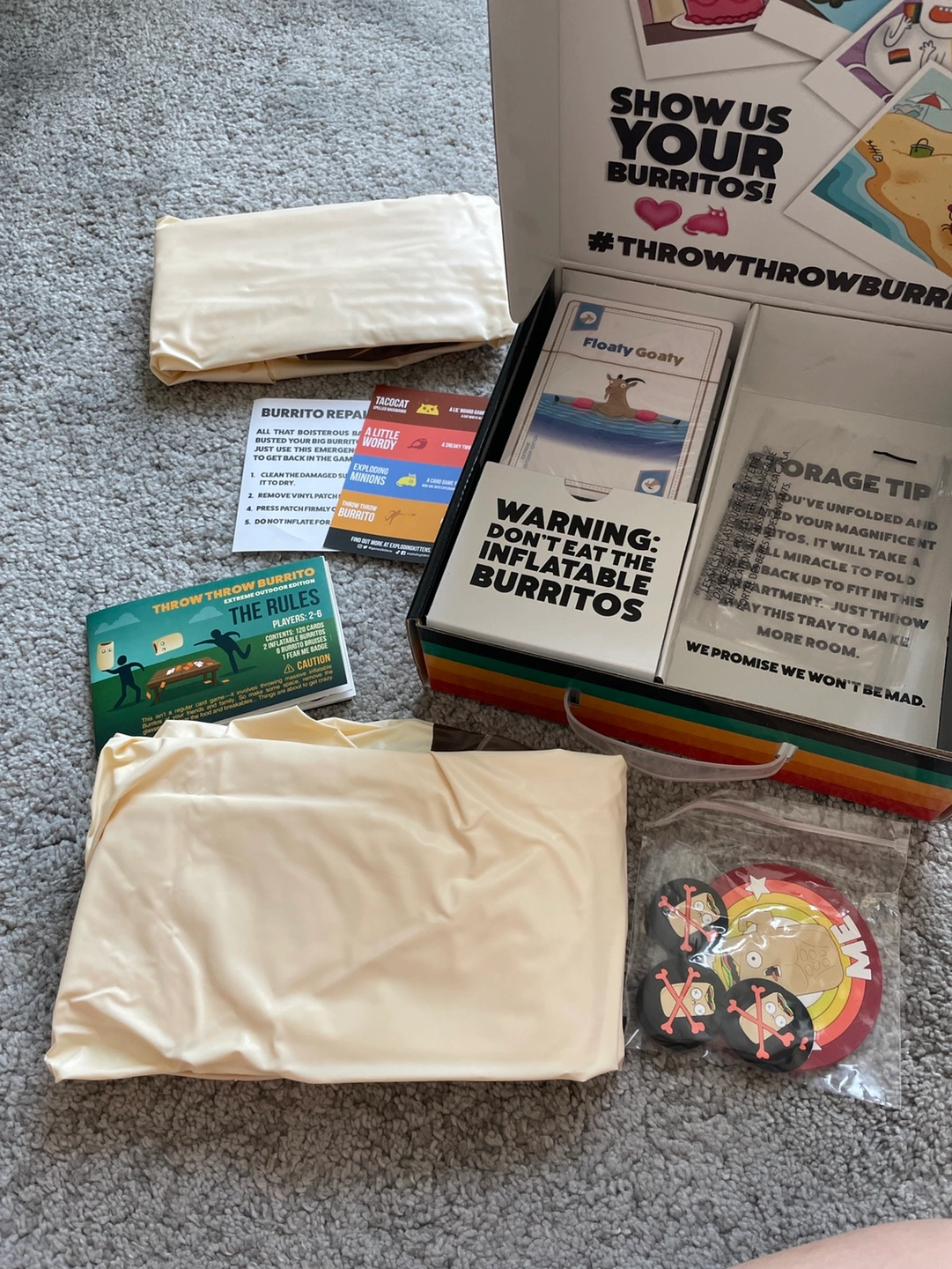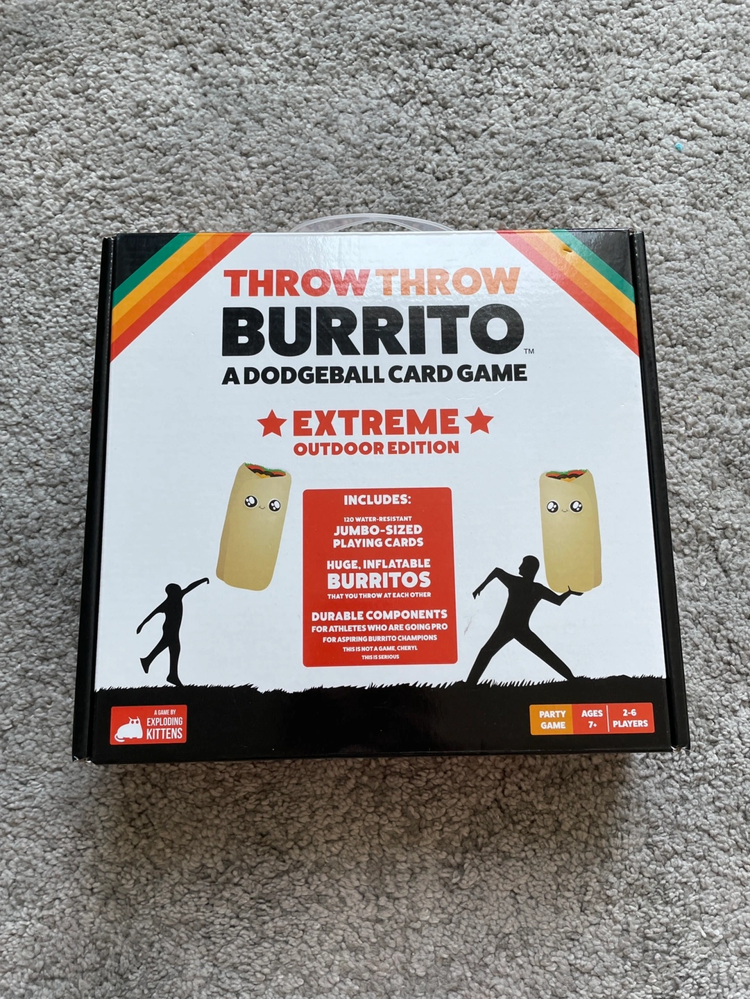 This is an outdoor version of the game Throw Throw Burrito. Brand new, not opened and is a great gift for kids to have fun with! Two huge inflatable burritos included, and big waterproof cards! Original price I bought it with was $30