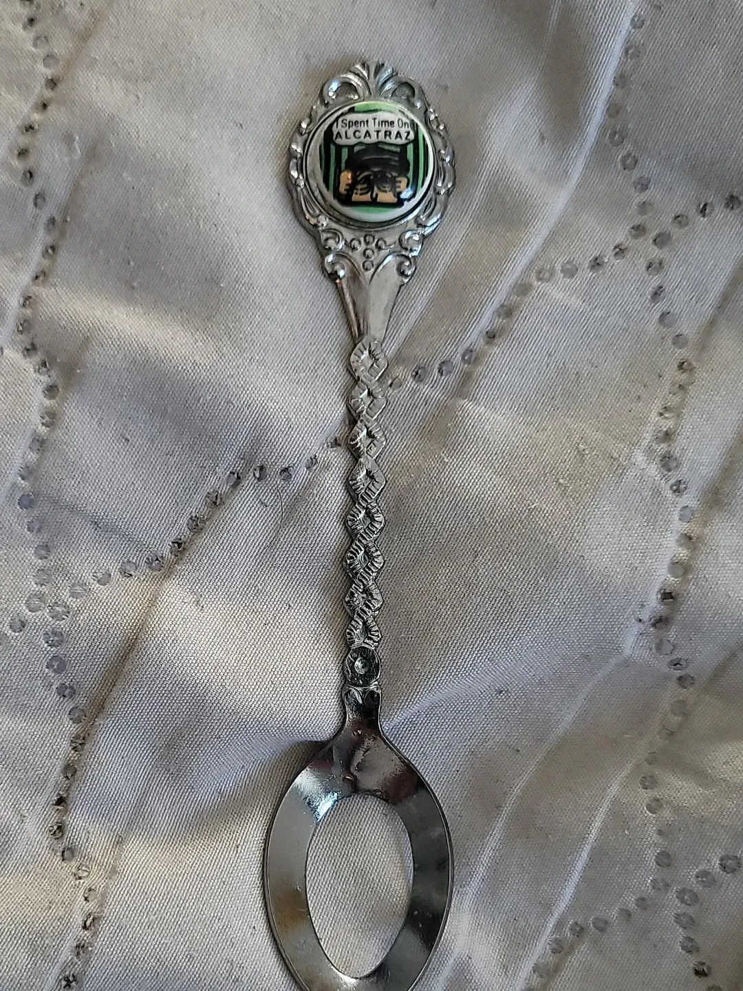 This is a souvenir spoon from Alcatraz. It features a decorative braided handle and a decorative oval shape at the end of the handle. The spoon's bowl has an oval cutout. It's a neat memento of a visit!