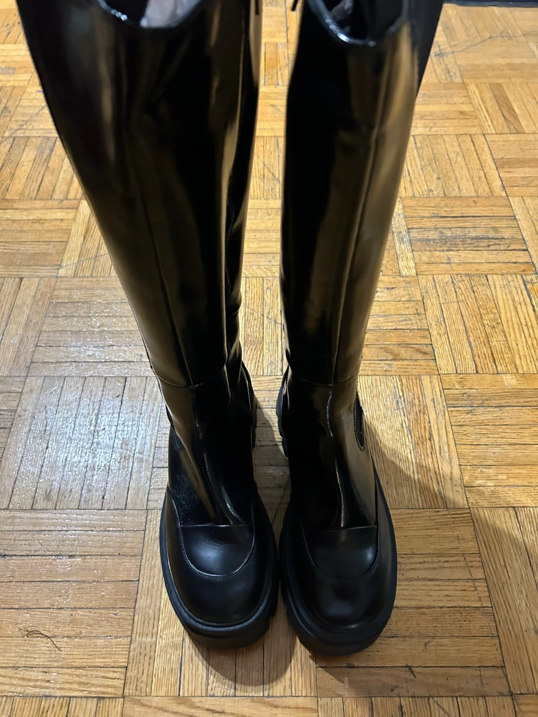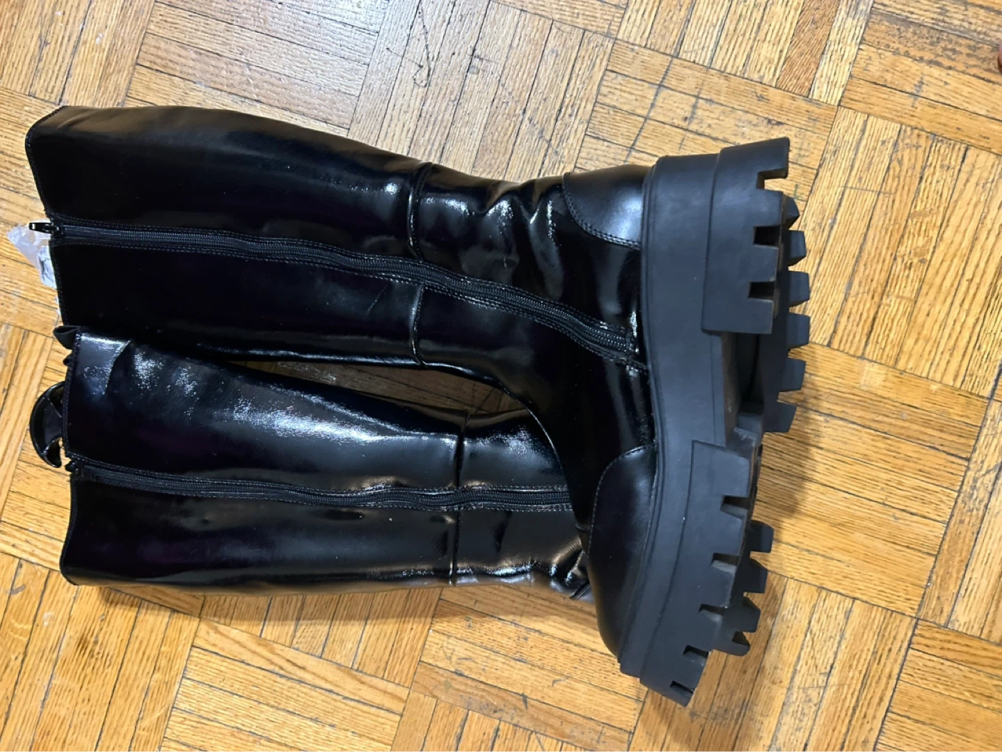 These black knee-high boots have a shiny finish and a lug sole. They feature a side zipper for easy on and off. Perfect for adding a bit of edge to your outfits!