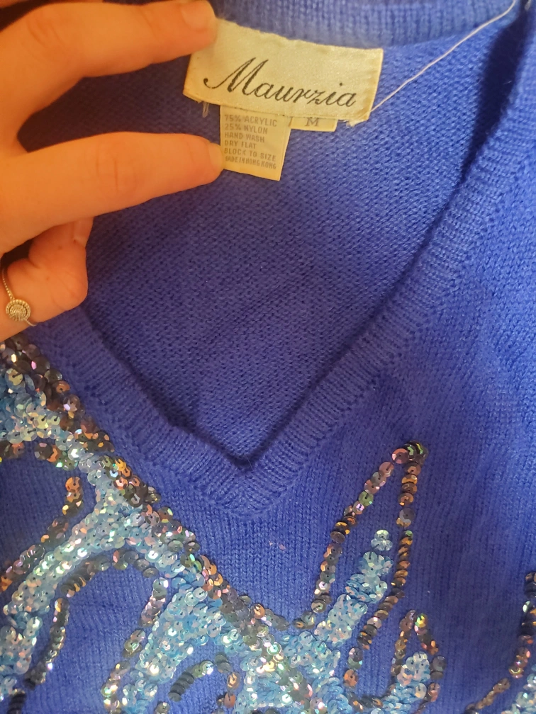 This is for vintage Sequin Sweater, size medium by Maurzia. Perfect for the holidays or to wear over the winter season. Pickup dufferin and Steeles area or shipping available for a fee.