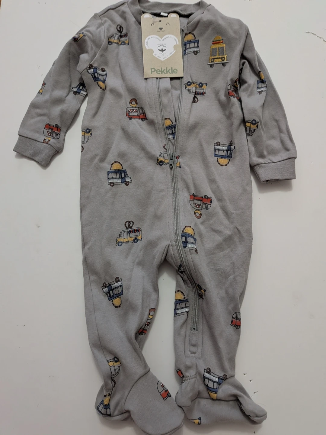 NEW This Pekkle footed pajama is grey with a fun all-over vehicle print. It's made for comfort for your little one. The material is soft and breathable. It's perfect for sleep or play! 6 months