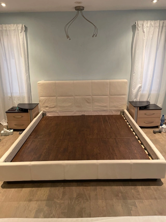 This King bed frame is in good condition and features a stylish, tufted headboard, ready to enhance any bedroom decor. The modern design will bring a touch of elegance to your space. Specifications: Size: King, Style: Modern, Colour: Cream. Looking to give this bed frame a new home. It's patiently waiting to bring comfort and style to its next owner. If the ad is up, it's available, so don't hesitate to reach out! I am asking $200 for the bed frame. Cash accepted.
