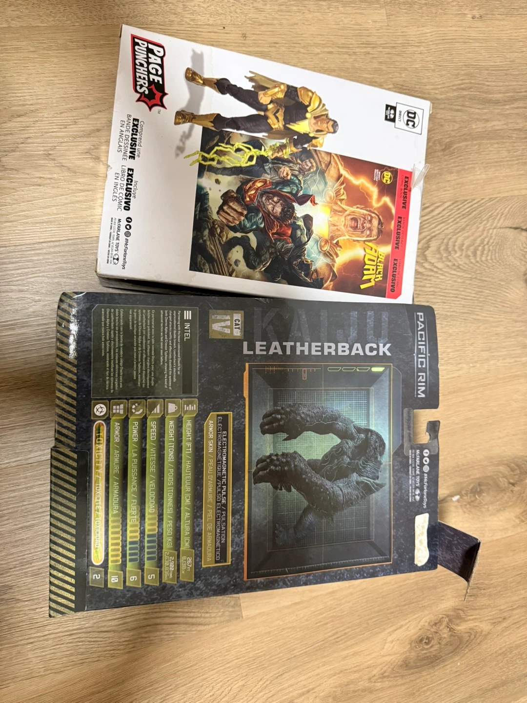 Includes a DC Comics Page Punchers Black Adam action figure with an exclusive comic book. Also includes a Pacific Rim Kaiju IV Leatherback action figure with its own exclusive comic book. Both figures are in their original packaging.