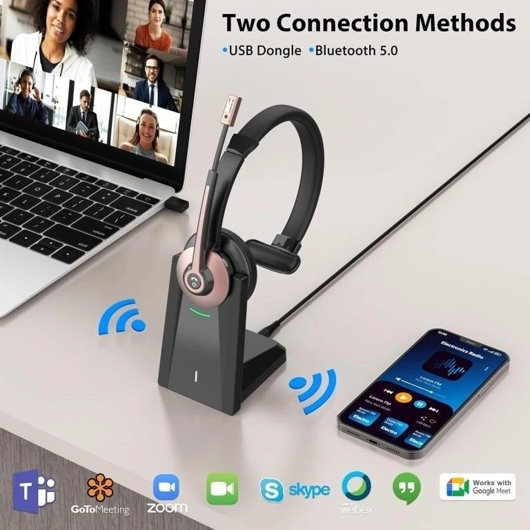 Wireless Bluetooth Headphones with Microphone, Noise Canceling & USB Dongle. V5.0 Trucker Bluetooth Headset with Mic Mute & Charge Dock for PC/Laptop/Phone/Meetings. Let me know if you're interested!