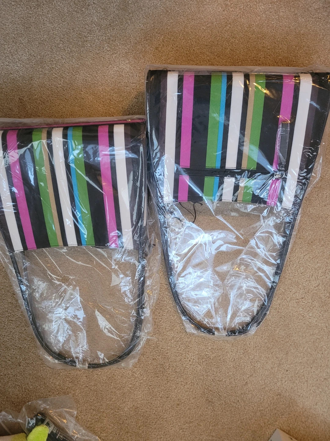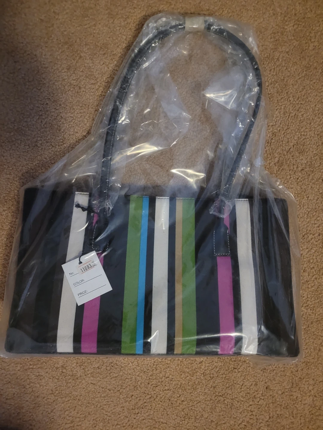 large tote bag and 2 smaller matching clutch, both featuring a multi-coloured stripe design on a black background. The tote has dual straps and zippers for closure. Both items are new and come in original plastic packaging.