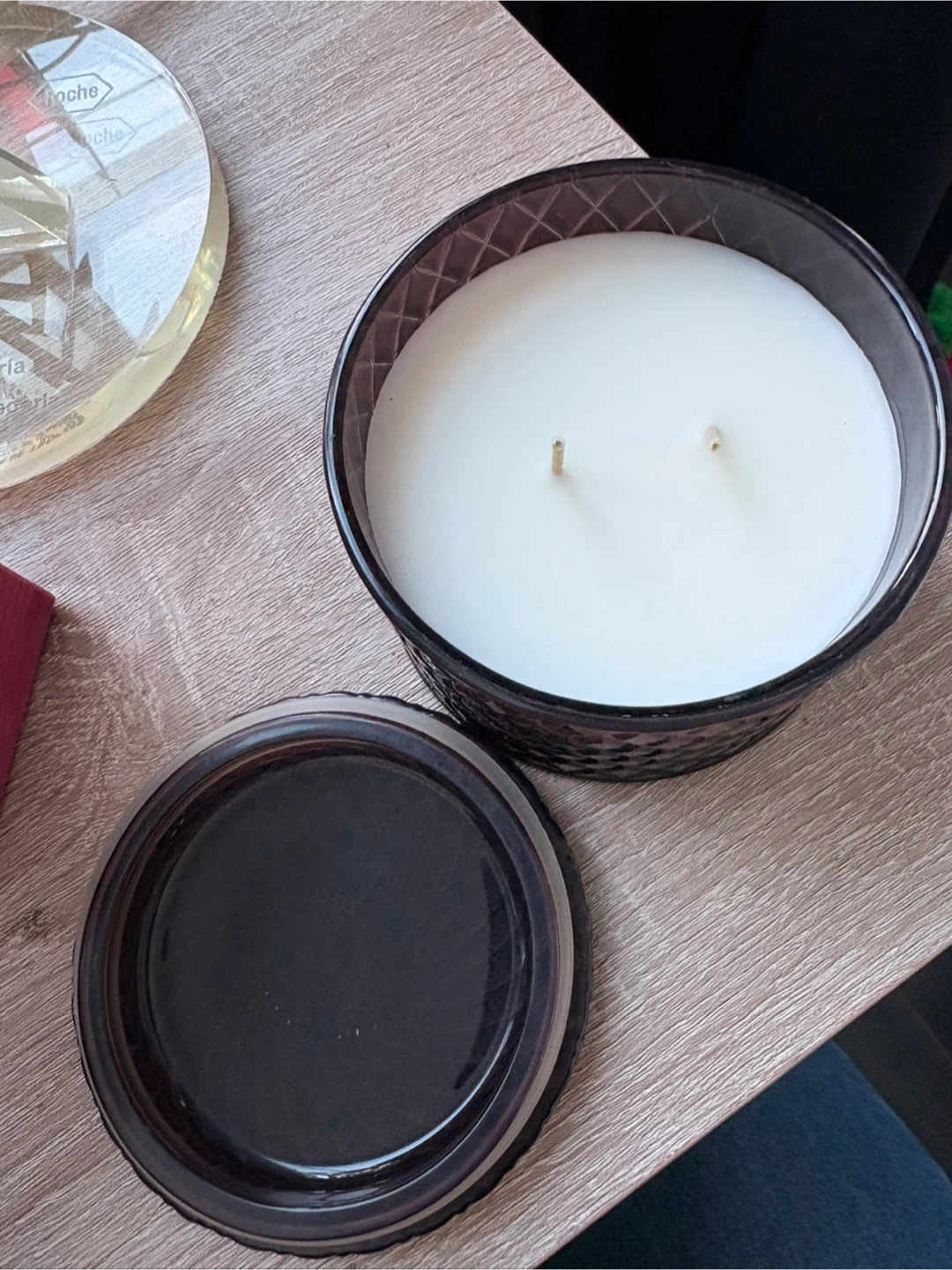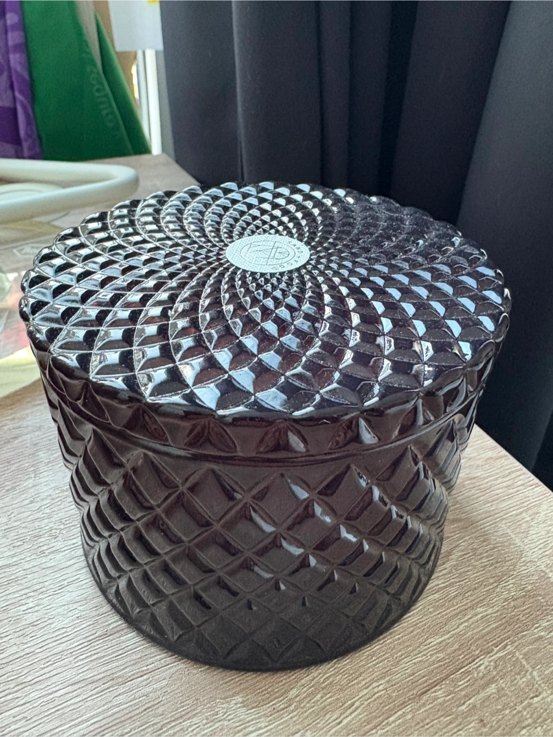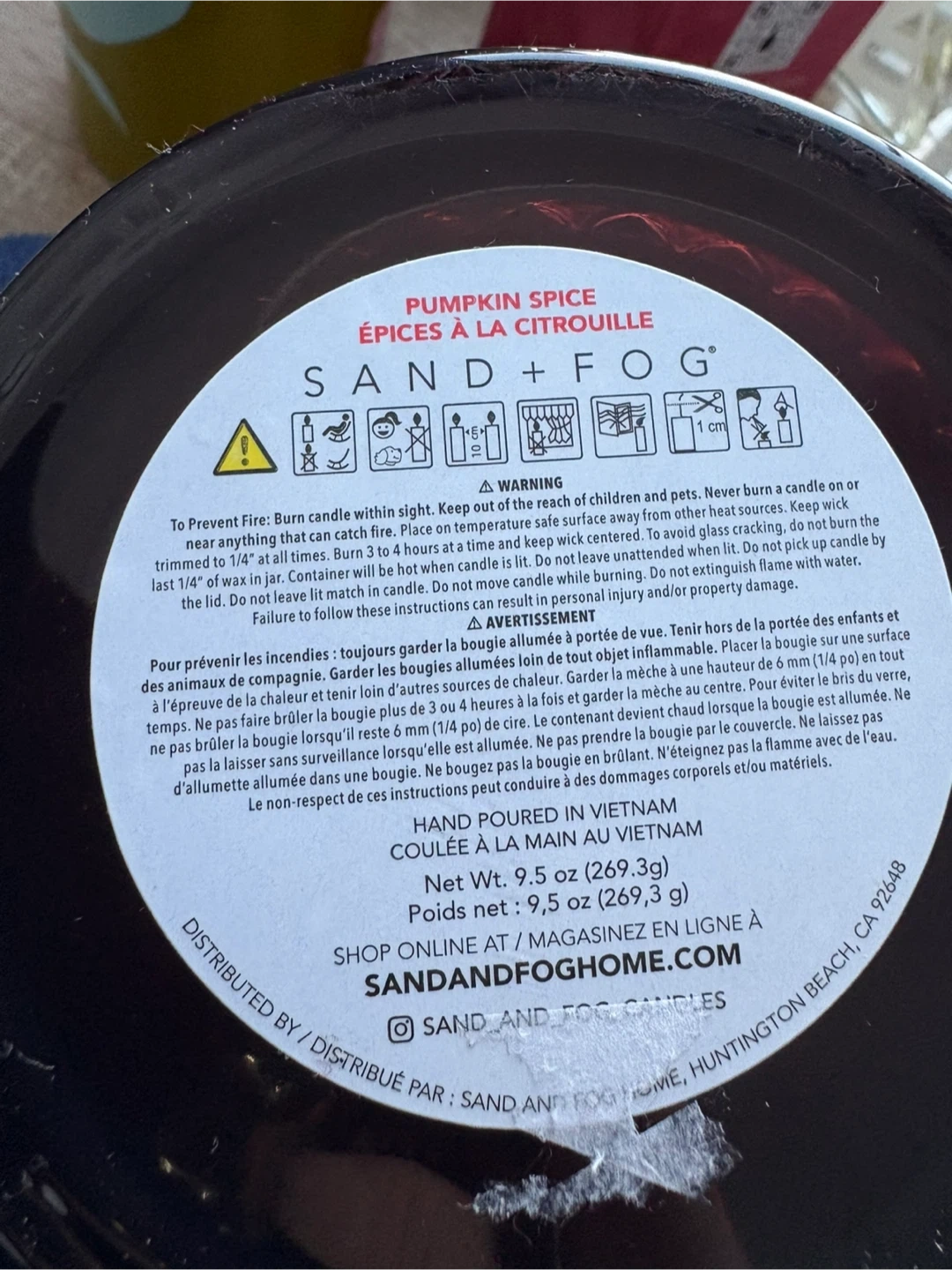 This is a Sand + Fog candle in the Pumpkin Spice scent. It's hand-poured in Vietnam and weighs 9.5 oz (269.3 g). The decorative glass container has a lid.