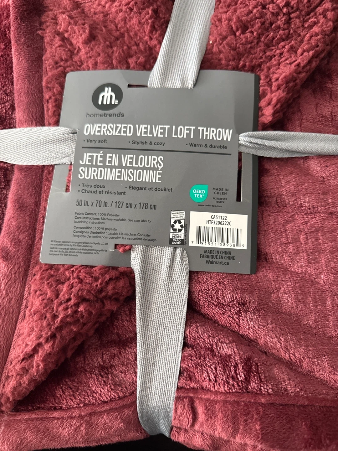 *Brand new!* This oversized throw is made from 100% polyester for a very soft feel. It's machine washable, making it easy to care for. The throw measures 50 in. x 70 in.