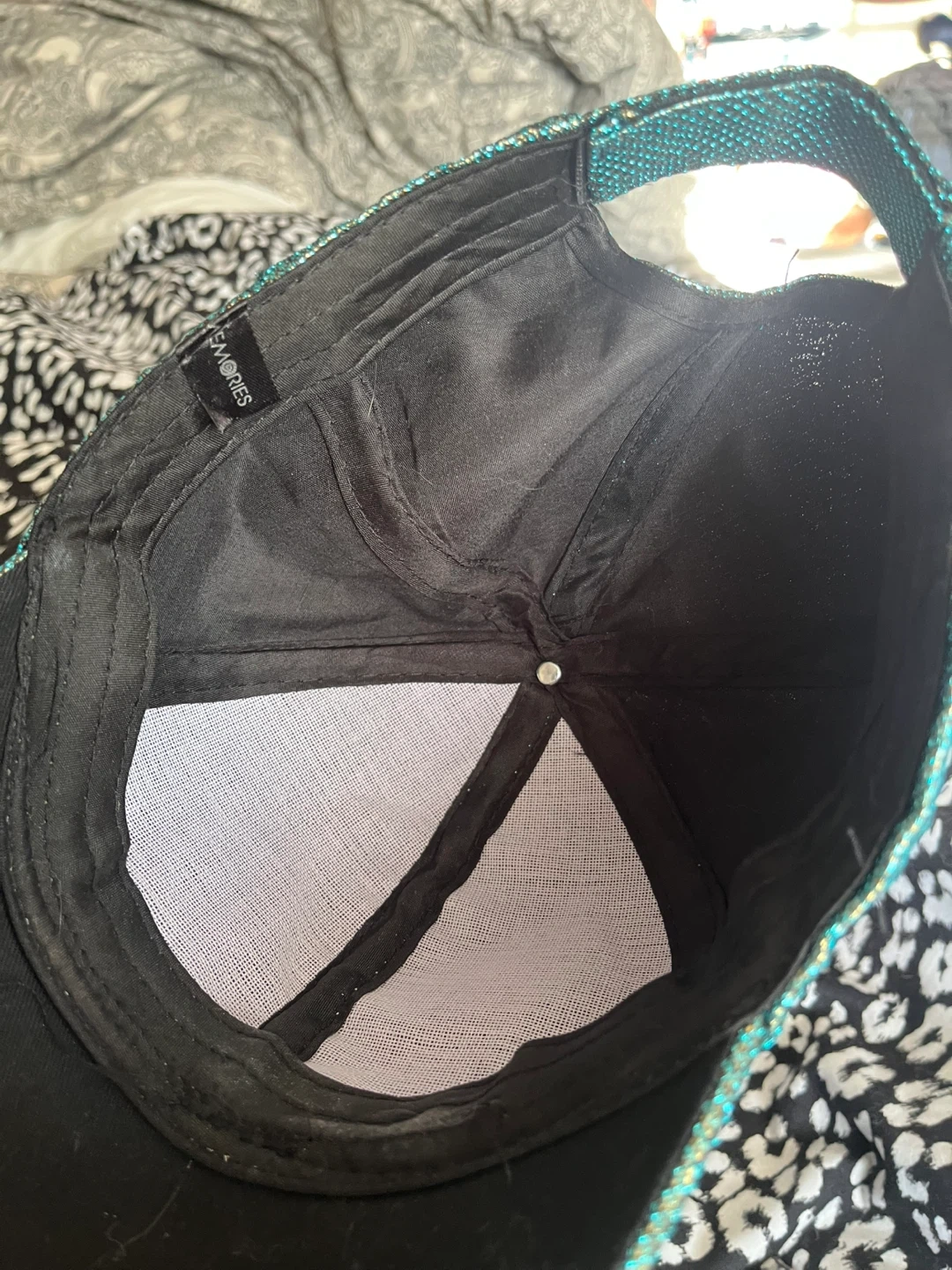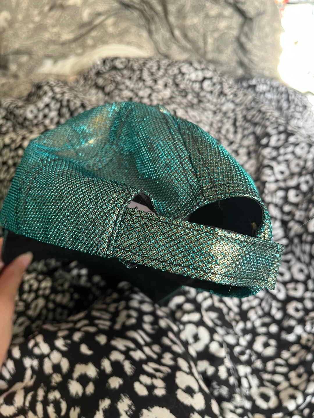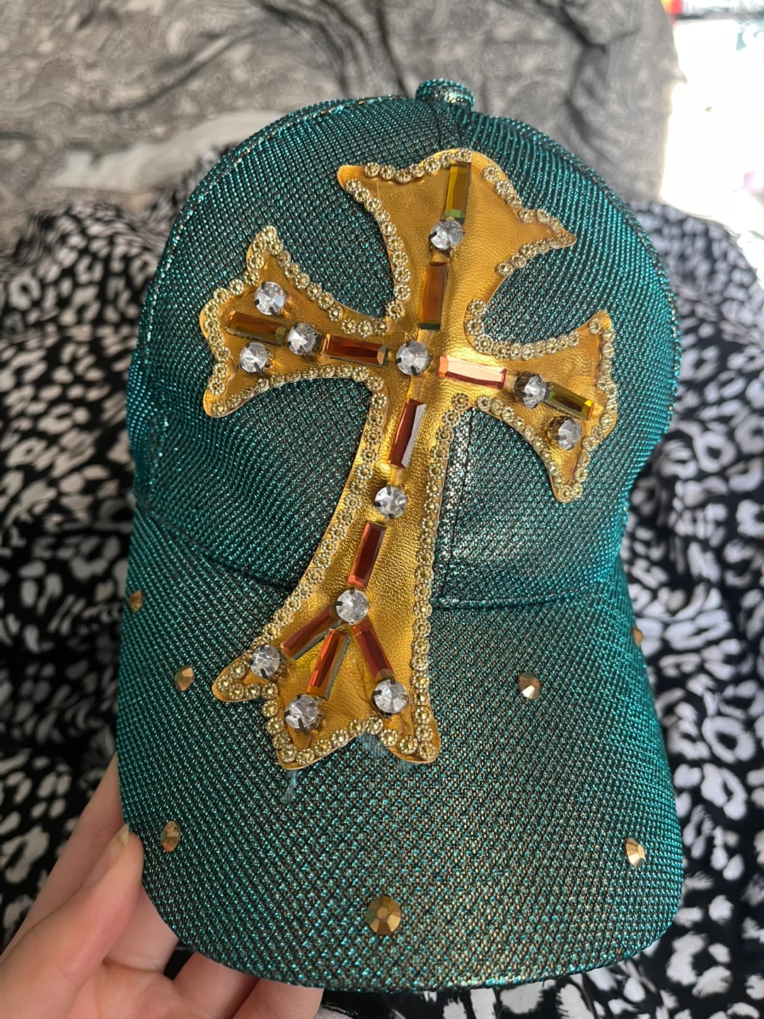 Check out this eye-catching S&MORRIES baseball cap! It features a unique cross design and a shimmering green fabric, perfect for adding some sparkle to your outfit