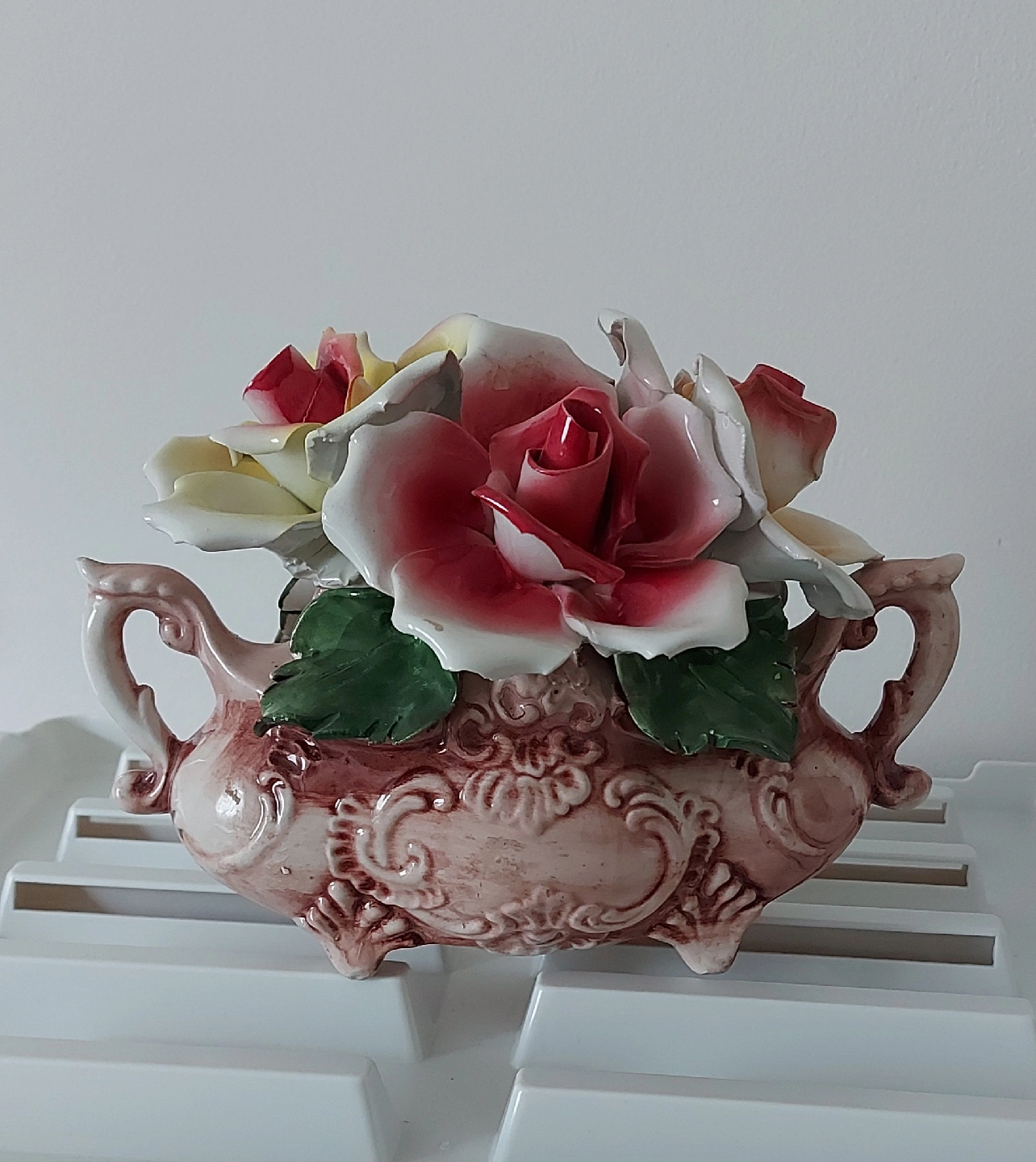 10Beautiful floral porcelain decor by S.Podimonti, made in Italy. This piece features a lovely arrangement of roses in soft pink, red, and white tones, set in an ornate, handled base. Perfect for adding a touch of Italian elegance to your home!