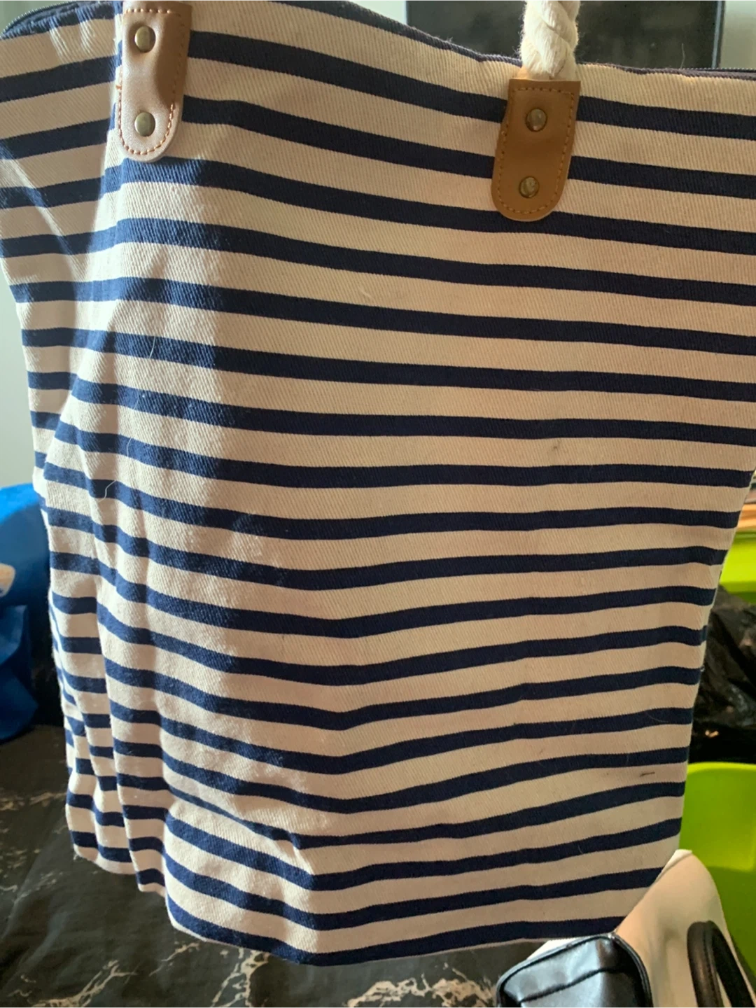 This is a S&R striped canvas tote bag. It features a rope handle and a zipper closure. It's in great condition and perfect for everyday use