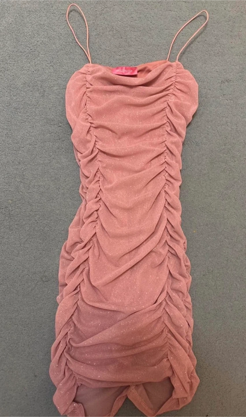 Misty Rose ruched party dress with a sparkle finish. It's a sleeveless, spaghetti strap style. This dress is perfect for a night out! Fits size XS and originally purchased for $90.