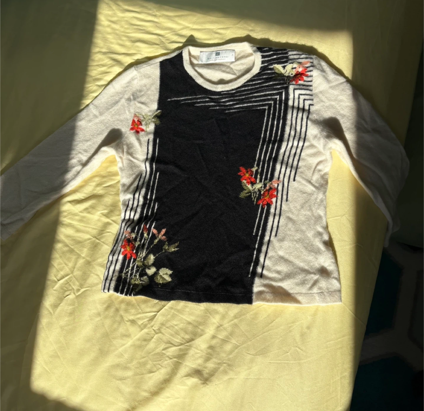 Cozy Ballantyne sweater made in Scotland from 100% pure cashmere! It features a unique design with floral embroidery.