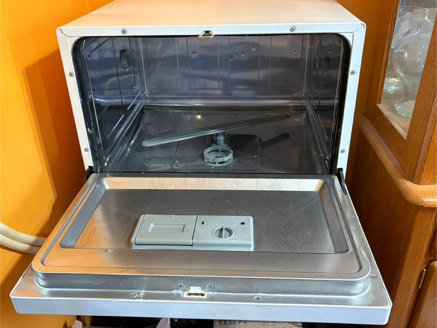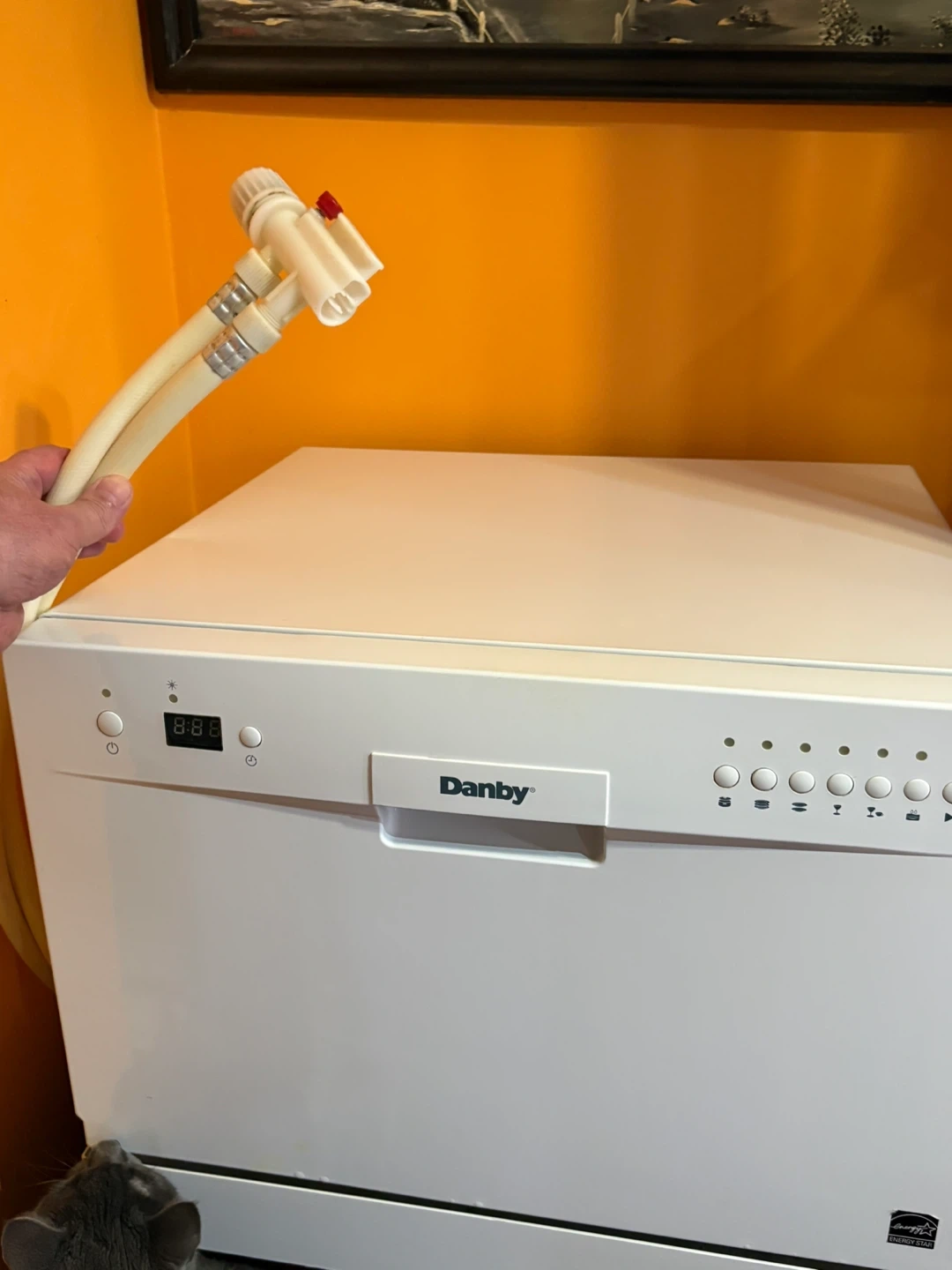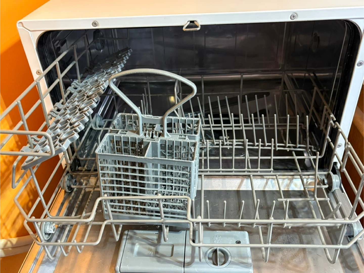 This is a white Danby countertop dishwasher. It includes the hoses and racks. It's a compact and efficient appliance for any kitchen. There are no leaks. The only reason I’m selling is because I live in an apartment building and I didn’t know that we weren’t allowed to have them as per the lease..
