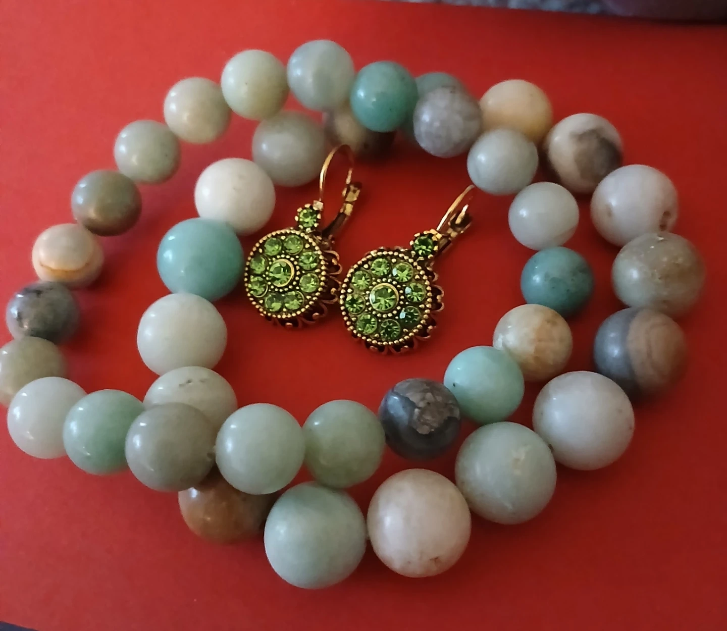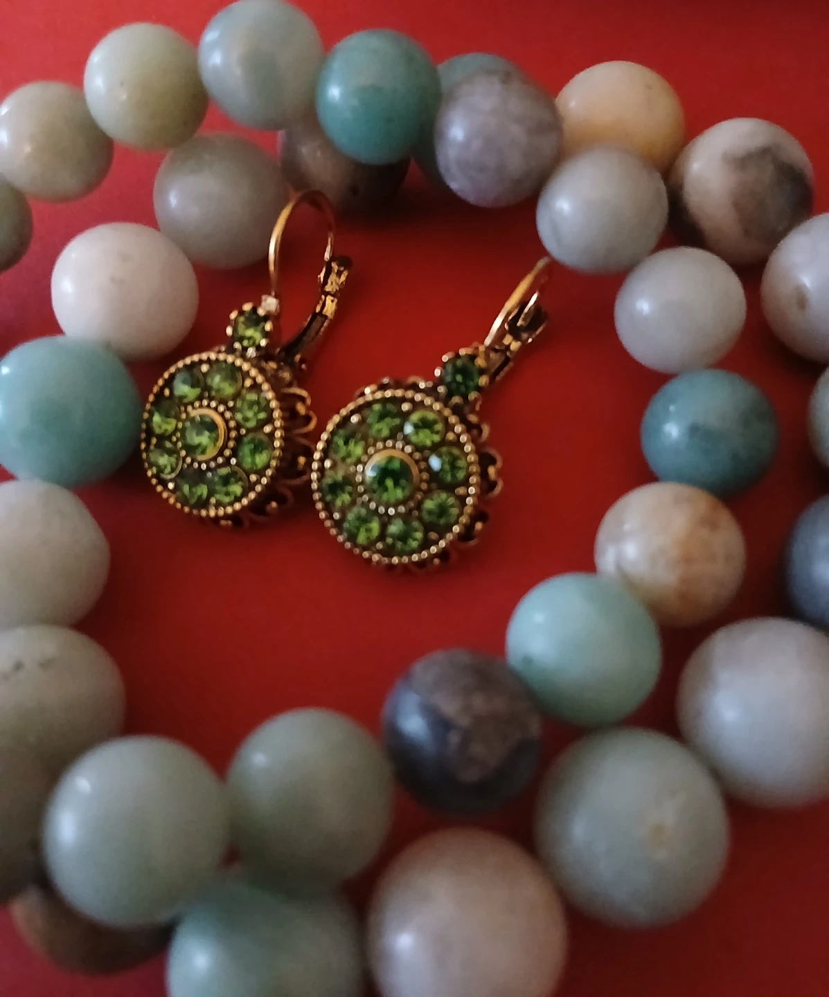 Beautiful vintage-inspired earrings featuring green stones and intricate gold-tone metalwork. These dangle earrings have a lever-back closure for secure wear. They're perfect for adding a touch of elegance to any outfit! The stones appear to be faceted glass or similar. 2 stone stretchy bracelets