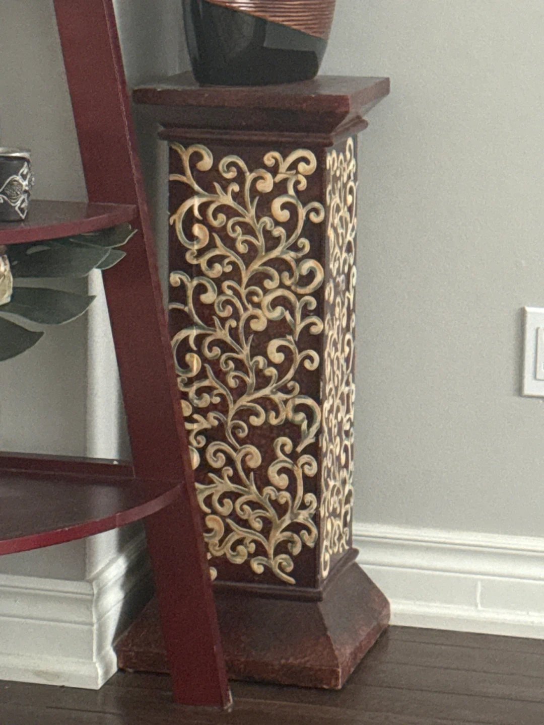This decorative pedestal stand features an ornate scroll design in a rich brown finish. It's perfect for displaying plants, sculptures, or other decor items. The solid construction ensures stability for your treasured items.