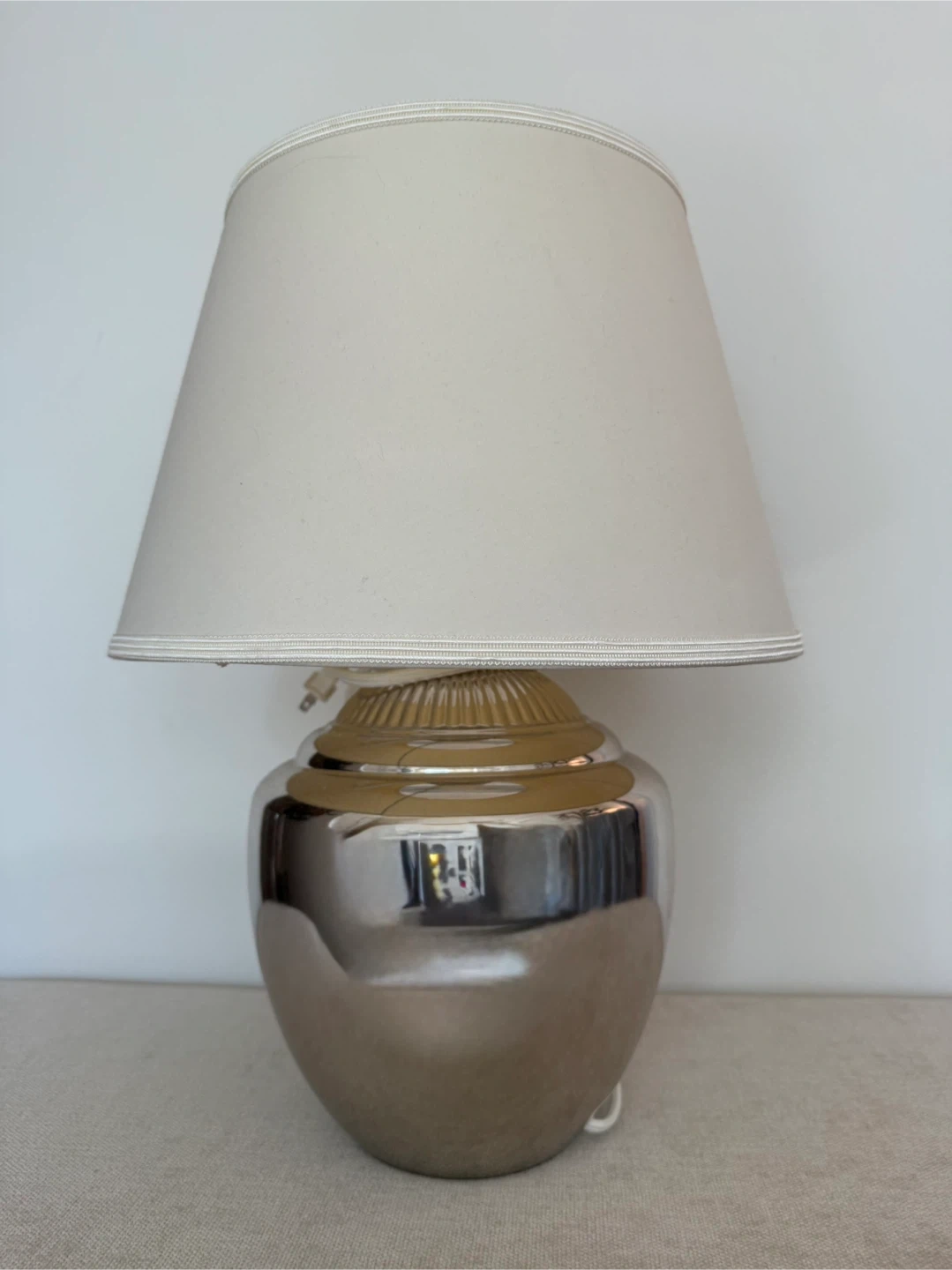 Selling a lovely silver table lamp with a cream-coloured shade.