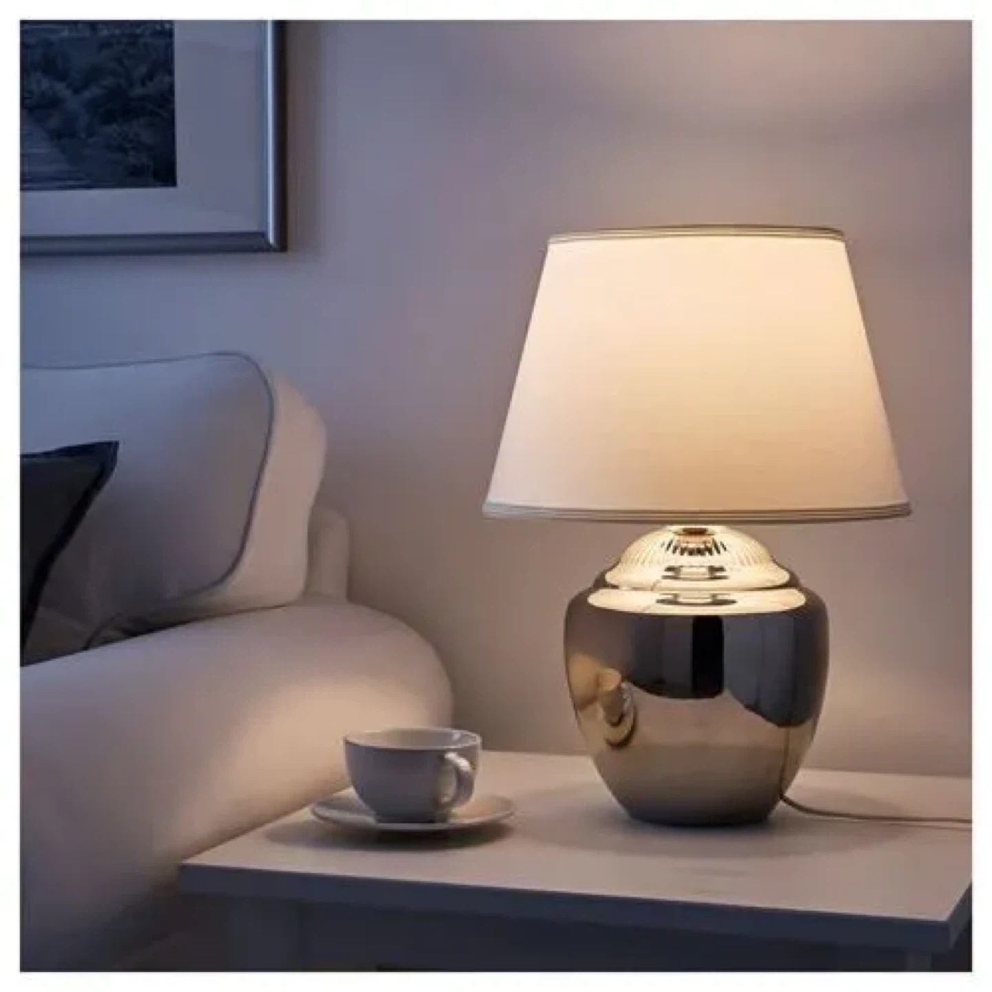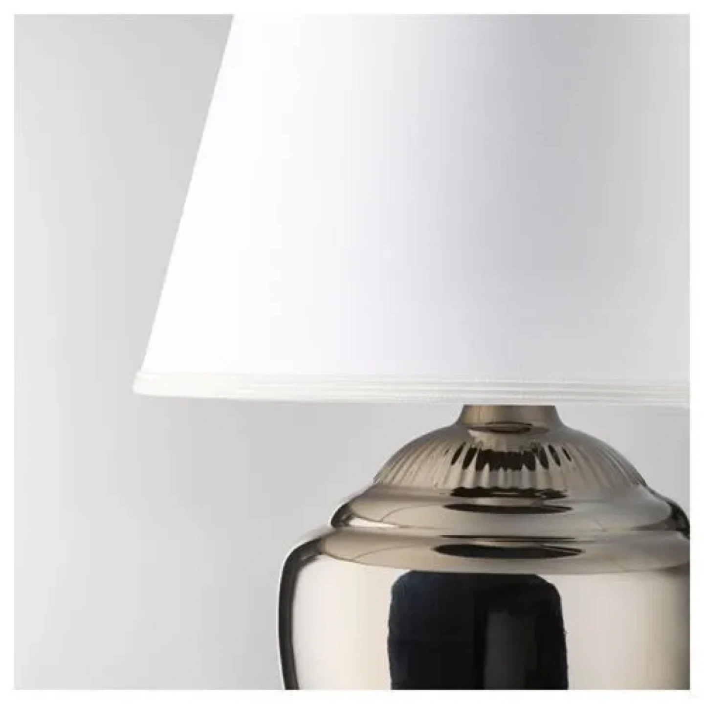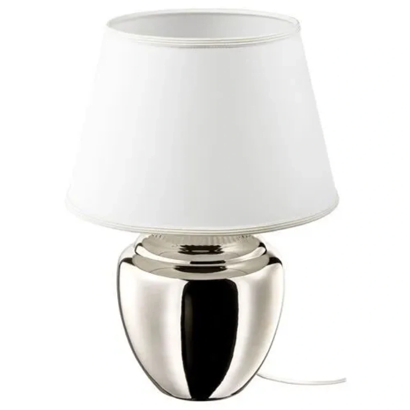 The base is shiny silver, and the shade is a classic tapered shape. It gives off a warm and inviting light!