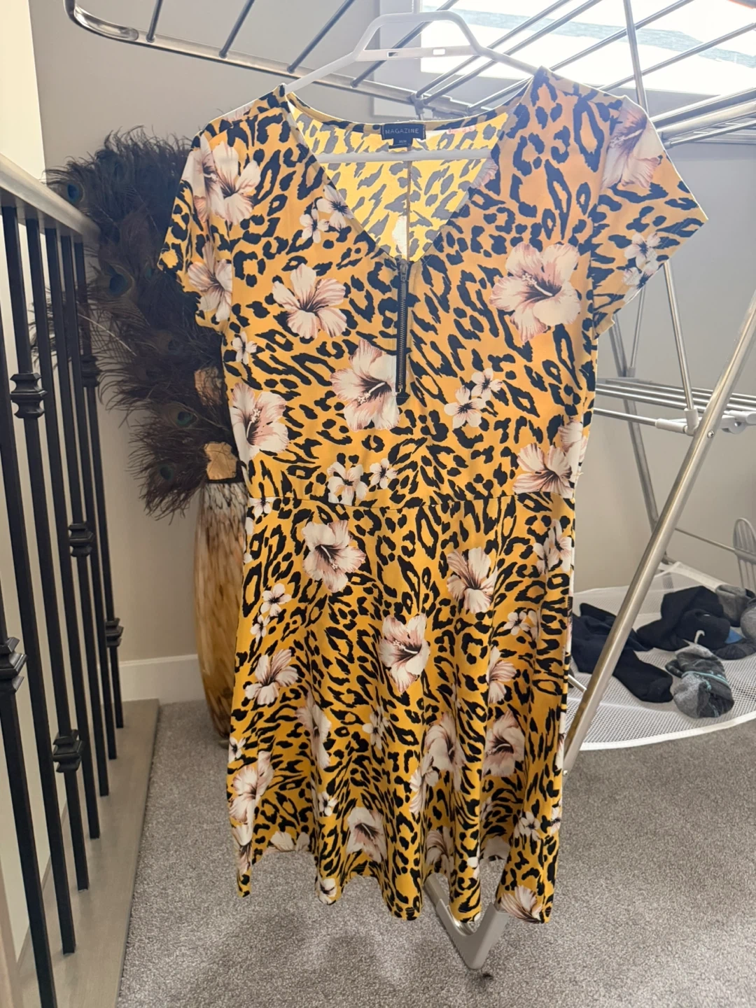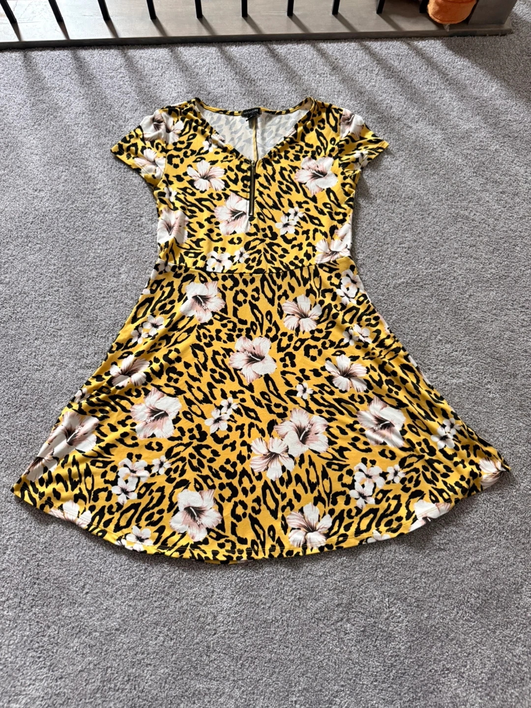 Classic straw sun hat with a wide brim and a black ribbon accent. This hat's woven design offers a stylish way to shield yourself from the sun. It's perfect for beach days or gardening. With a beautiful yellow, cheetah print with flowers floaty dress. Perfect for any summer occasion with a zipper.